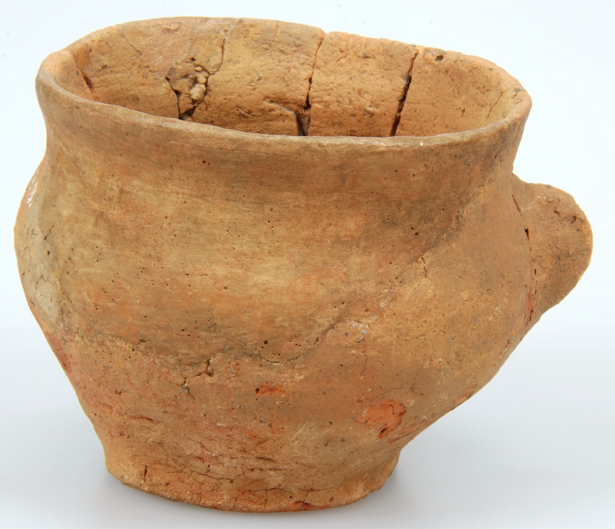 Urn; handgevormd aardewerk; klein, bolvormig potje met verticaal uitgeknepen oor op de buik; standvlak; fijne steengruis magering; inhoud: crematieresten fragmenten rotsbeenderen, melkkies en een fragment pijpbeen van een kind.