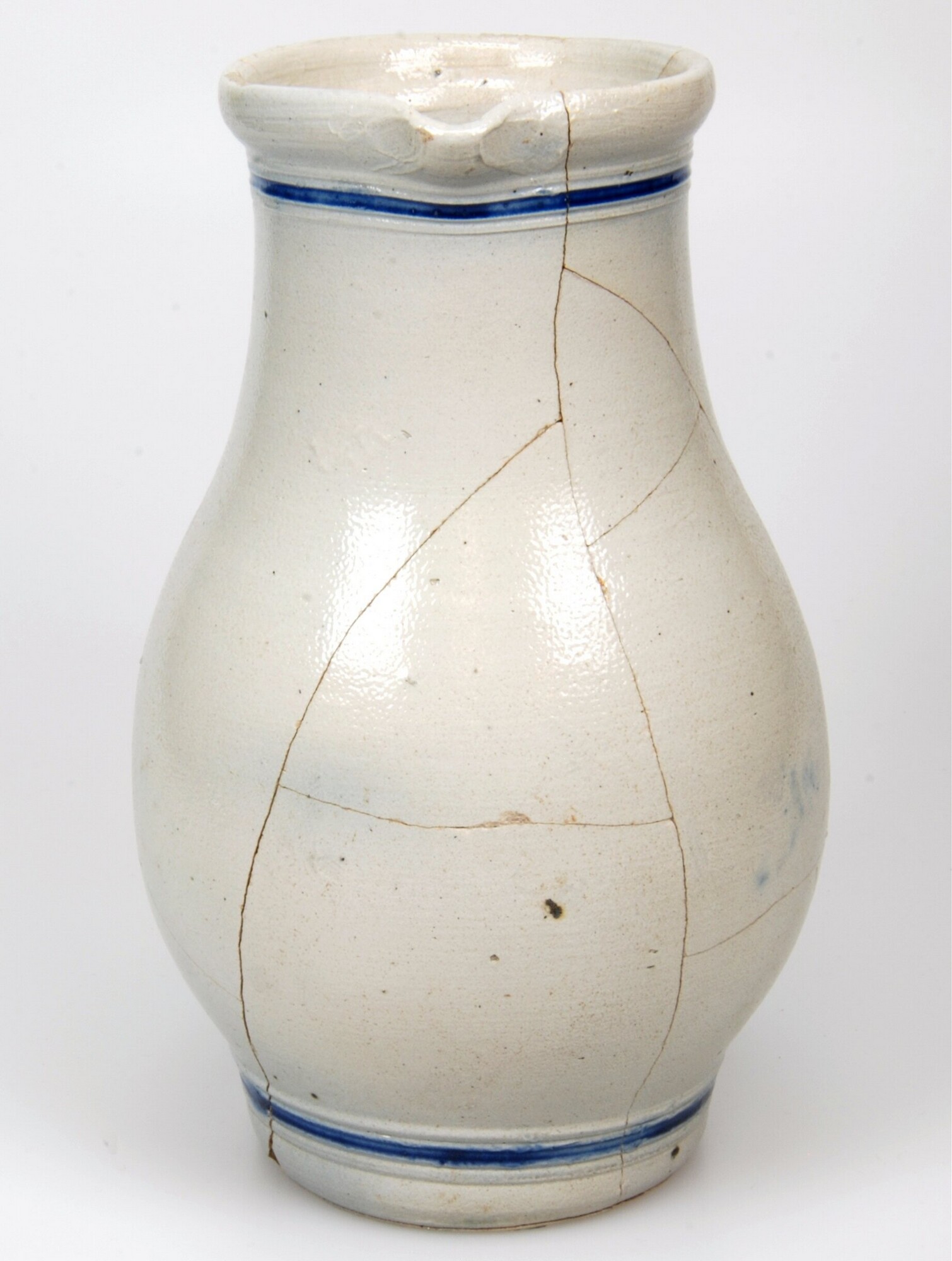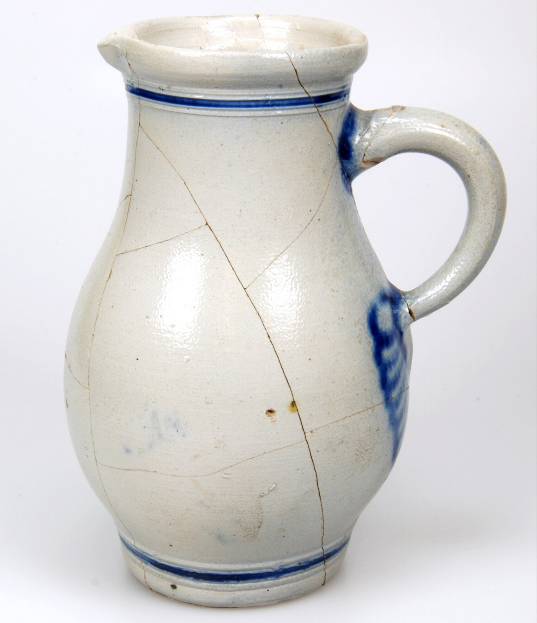 Kan; s2-kan-69; steengoed met zoutglazuur en kobaltoxide; rand en voet blauwe bies, bloemen om oor; standvlak; één verticaal worstoor; '3' naast oor; herkomst: Westerwald