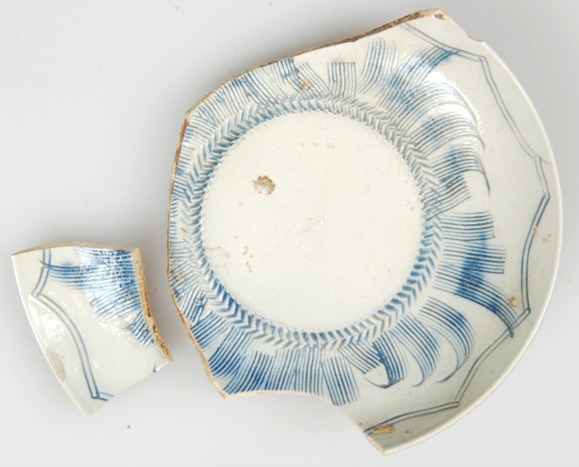 Bord; s3-bor-2; steengoed; zoutglazuur, kobaltblauw; vl: parallelle strepen; sp: visgraat radstempel en gekrulde lijnen; standring; scratch-blue; herkomst: Engeland