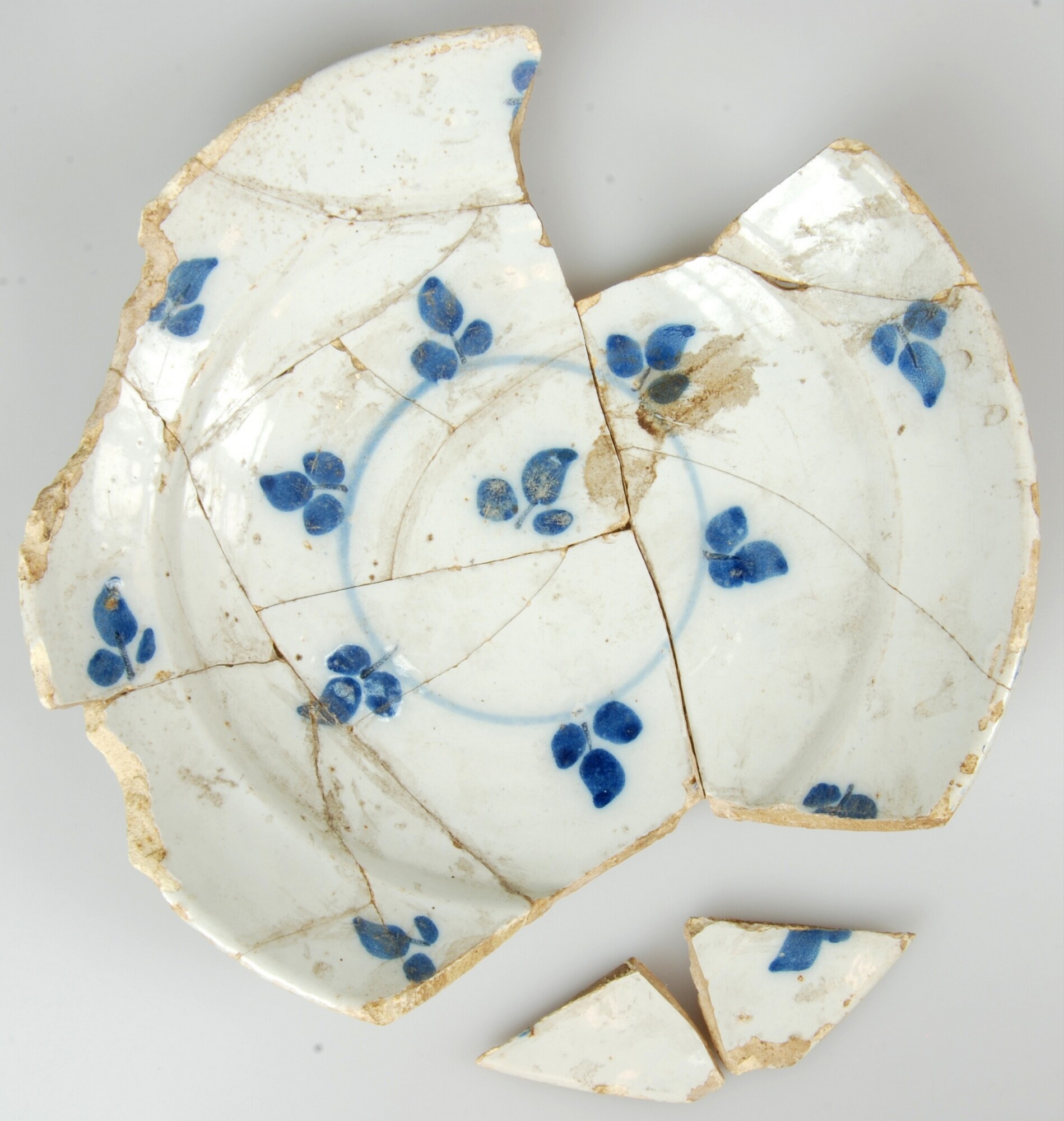 Bord/schotel; f-bor-5; afgerond bord met platte bodem en smalle vlag; faience; tinglazuur; blauw op wit: vl: bloemen, sp: bloemen en concentrische cirkel; standvlak