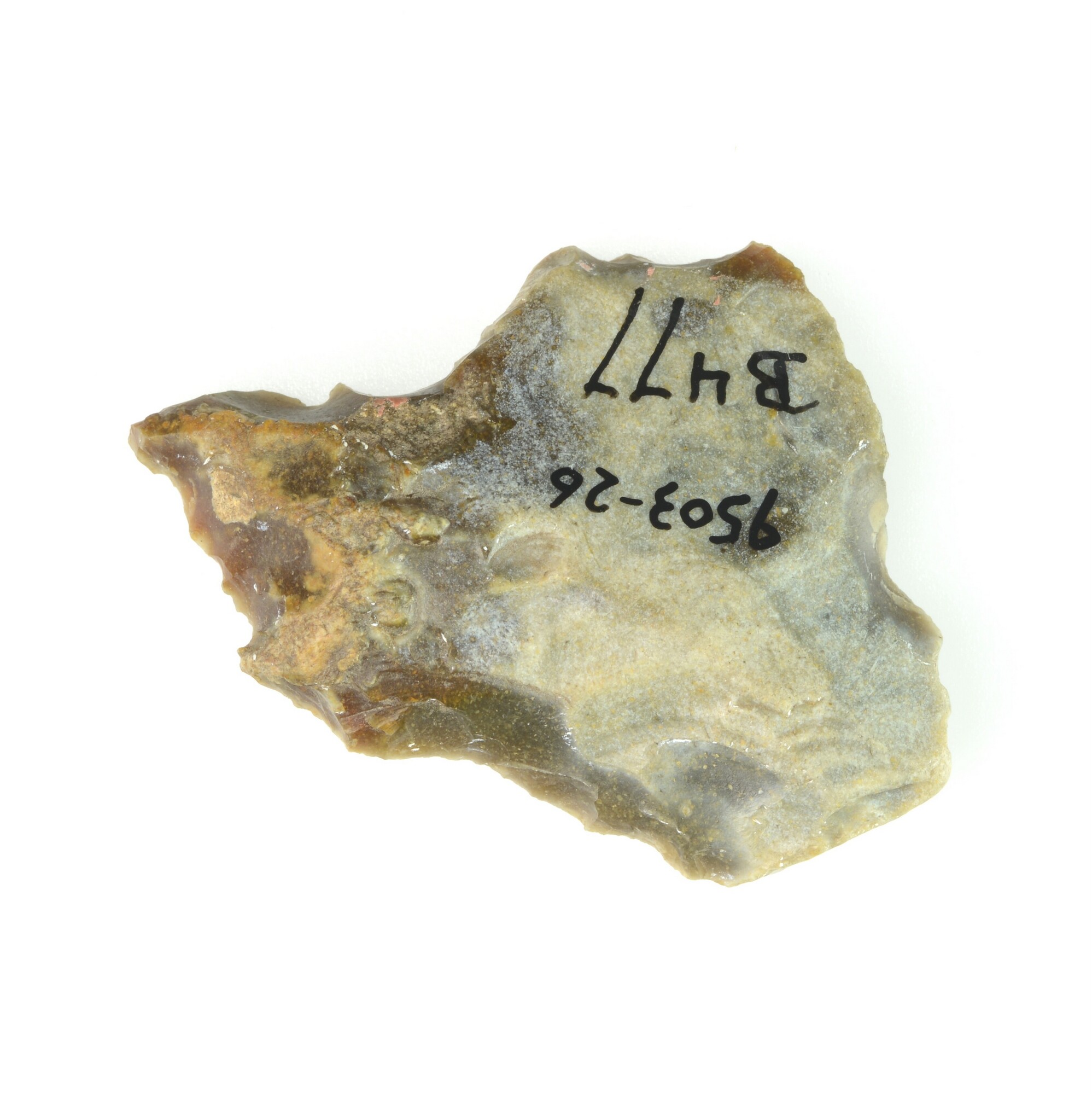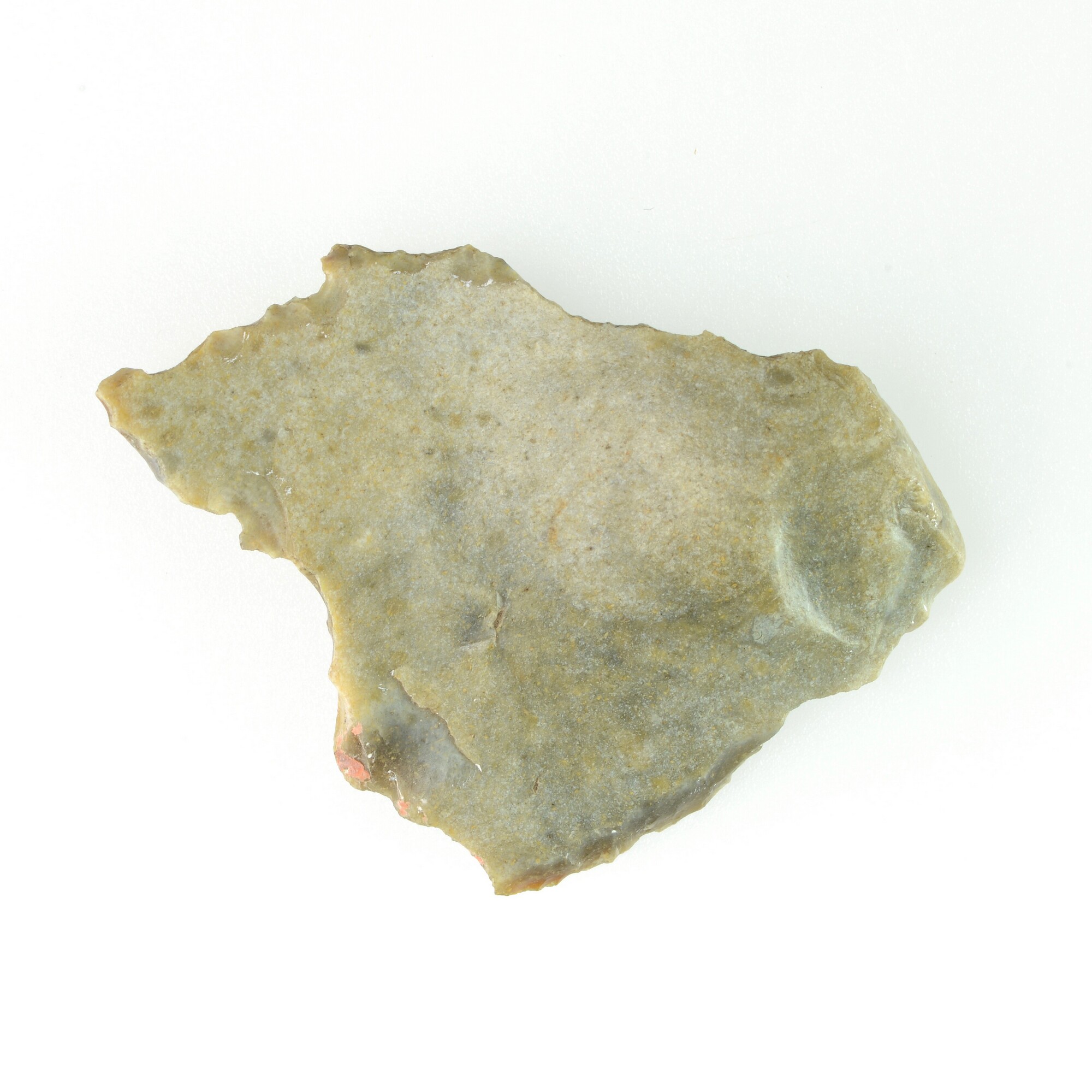 Afslag; slagvlakrest is niet gefacetteerd. Gevormd door één groter zijdelings negatief en een fragment van een ander. De slaghoek bedraagt 110 graden. Twee grote dorsale negatieven met ongeveer dezelfde slagrichting als de afslag zelf, en een kleinere; restant cortext aanwezig; wit gepatineerd; bruin-grijs Maas-vuursteen