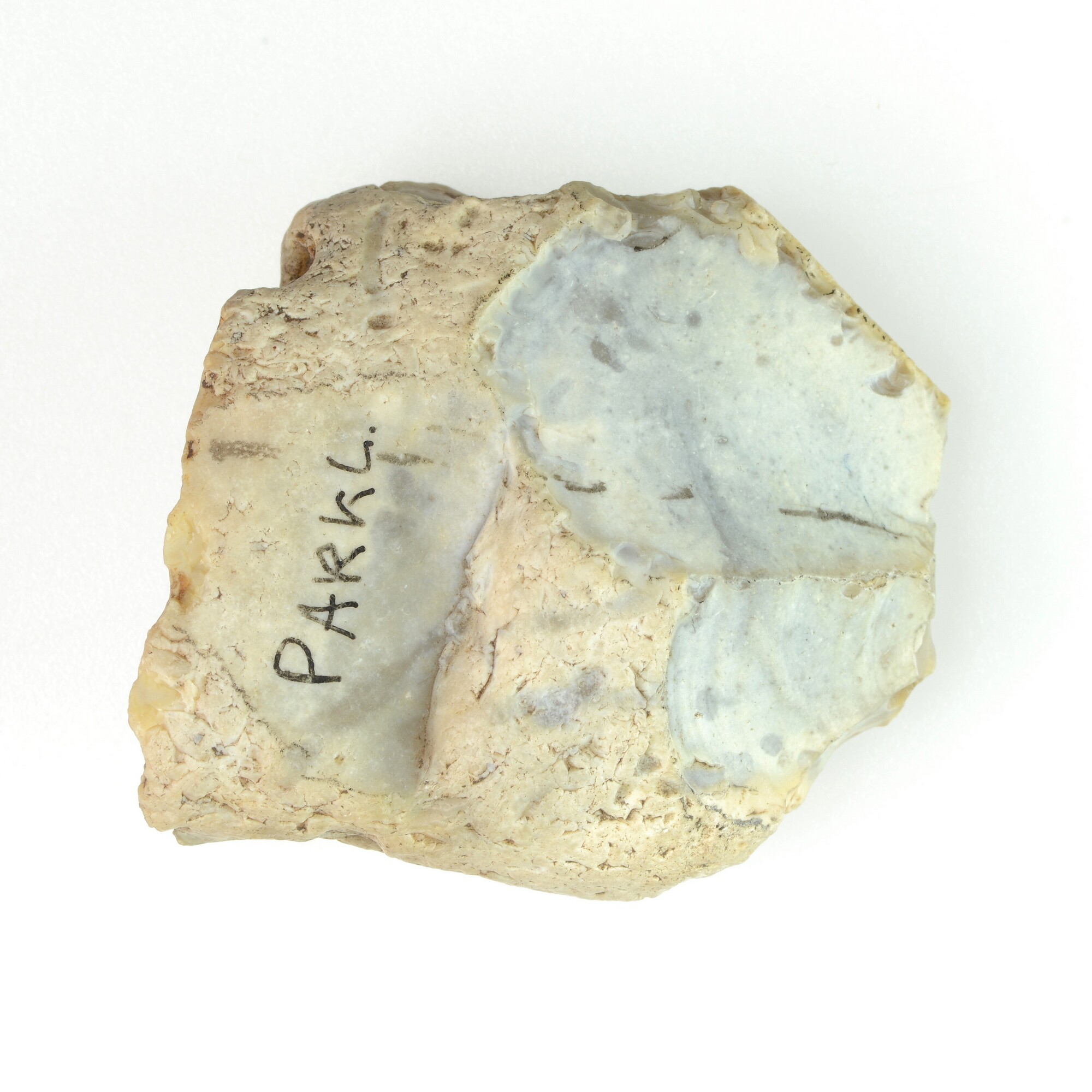 Afslag; slagvlakrest als gevolg van recente beschadigingen verdwenen; twee tot drie dorsale negatieven en de afslag is bedekt met windlak en witte patina