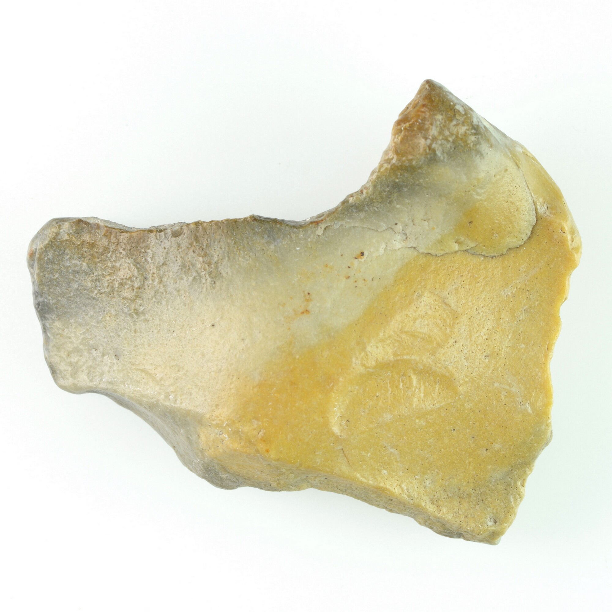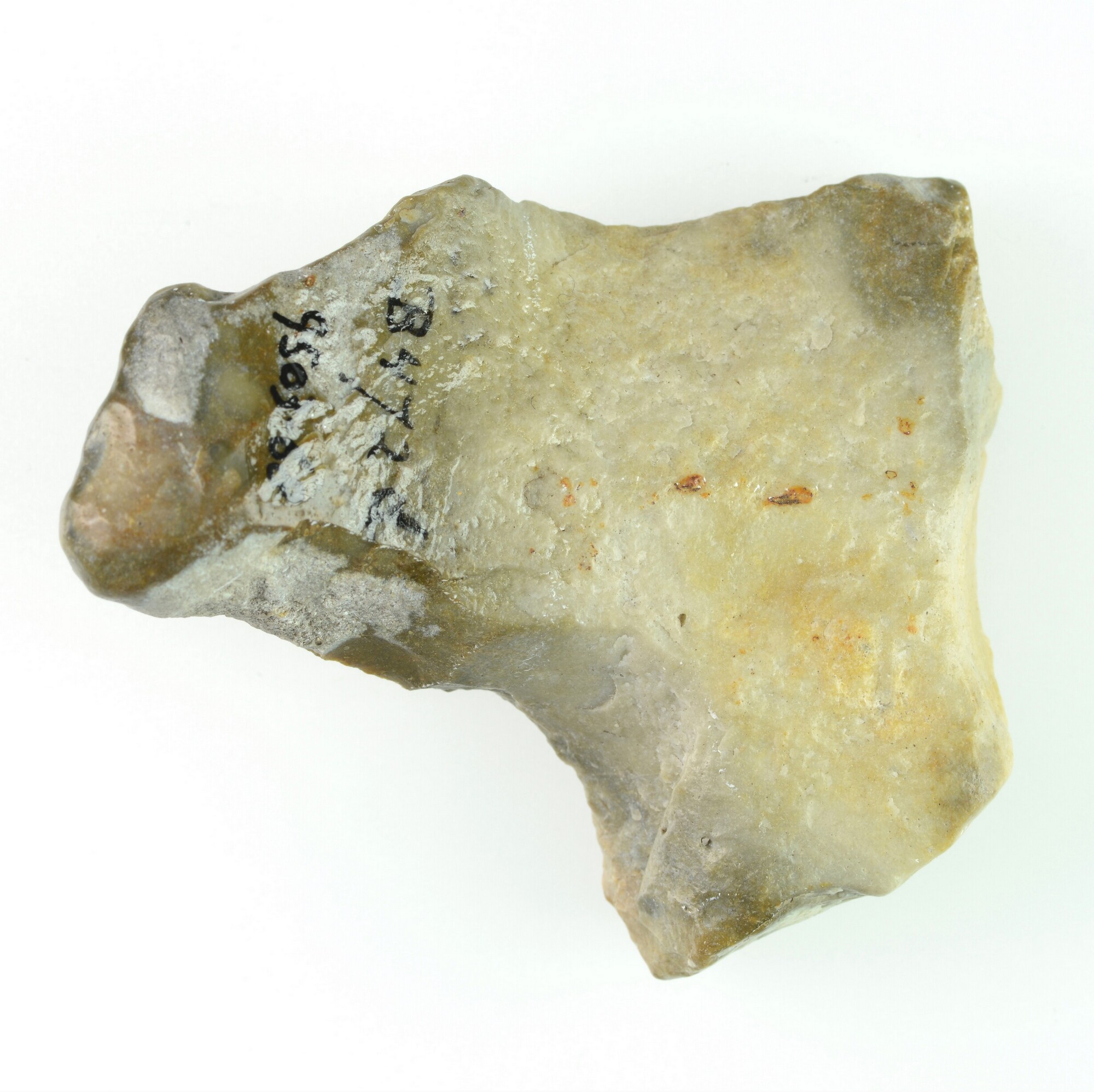 Afslag; dorsaal negatief naar slagvlak; witte patina; grijs vuursteen; x-coördinaat: 138.625/ y-coördinaat: 471.205