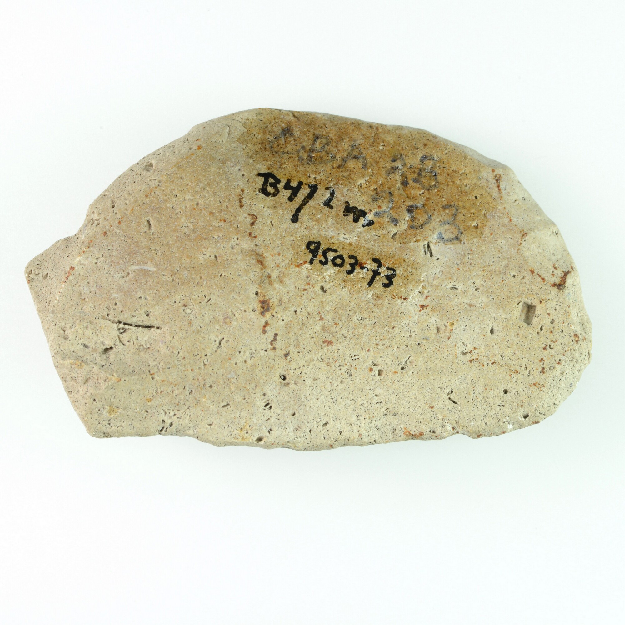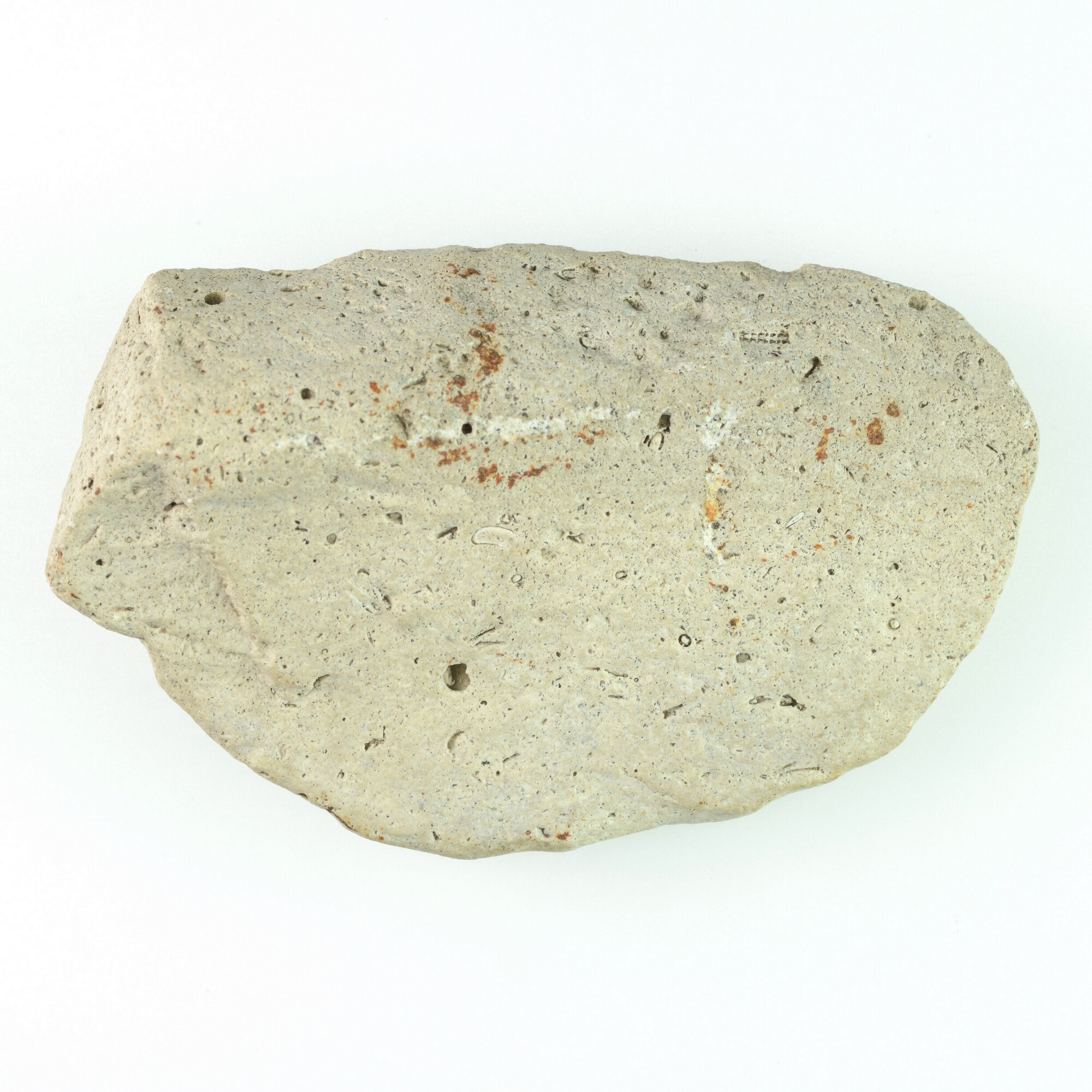 Afslag; witte patina; met rug; beige/grofkorrelige bryozoen vuursteen; x-coördinaat: 138.350/ y-coördinaat: 471.200