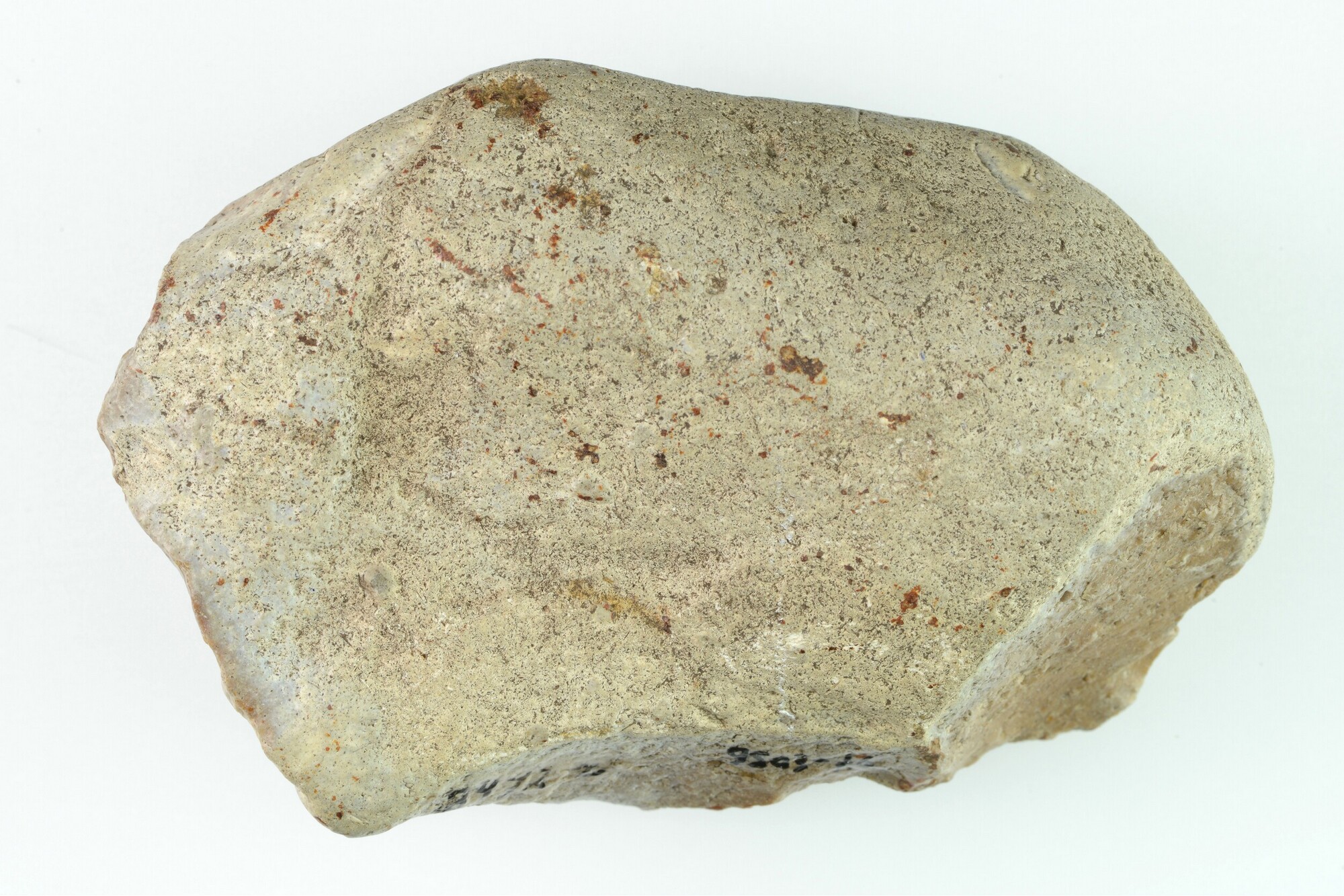 Kern; eenzijdig bifaciaal bewerkt. Kernrand ontbreekt, rand grof geretoucheerd; typologisch grove schaaf (recht); bruine patina; grijze vuursteen; x-coördinaat: 138.615/ y-coördinaat: 471.240