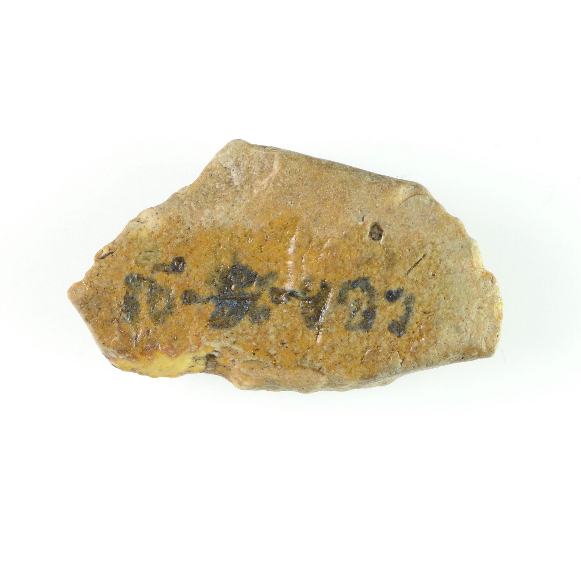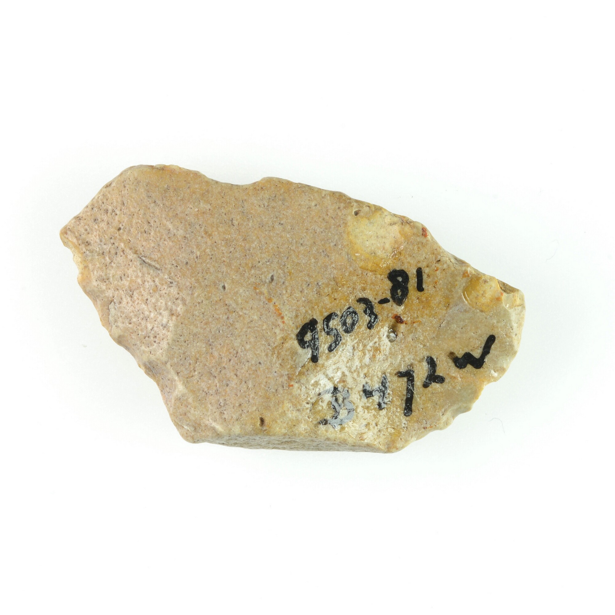 Productieafslag; schaafje, convex op bladvormig splijtstuk; dorsaal convex; witte patina; beige vuursteen