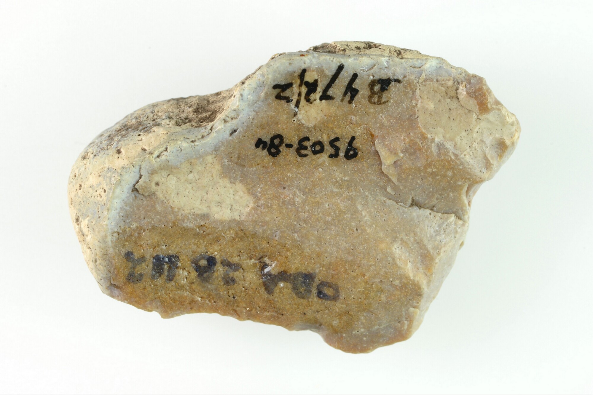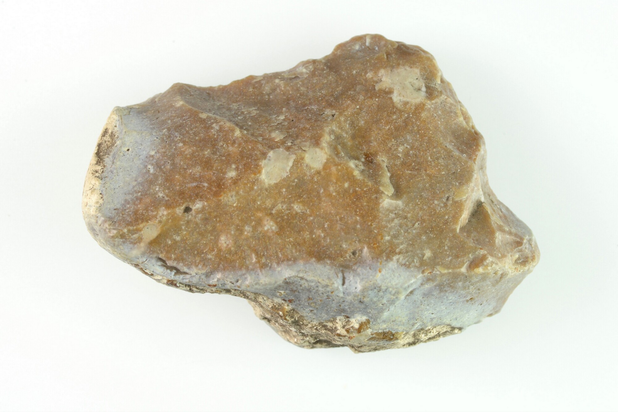 Afslag; dikke afslag met rug (cortex). Dubbele slagpunten. Dorsaal bedekt met negatieven (rugmes?); witte patina; bruin vuursteen; x-coördinaat: 138.475/ y-coördinaat: 471.150