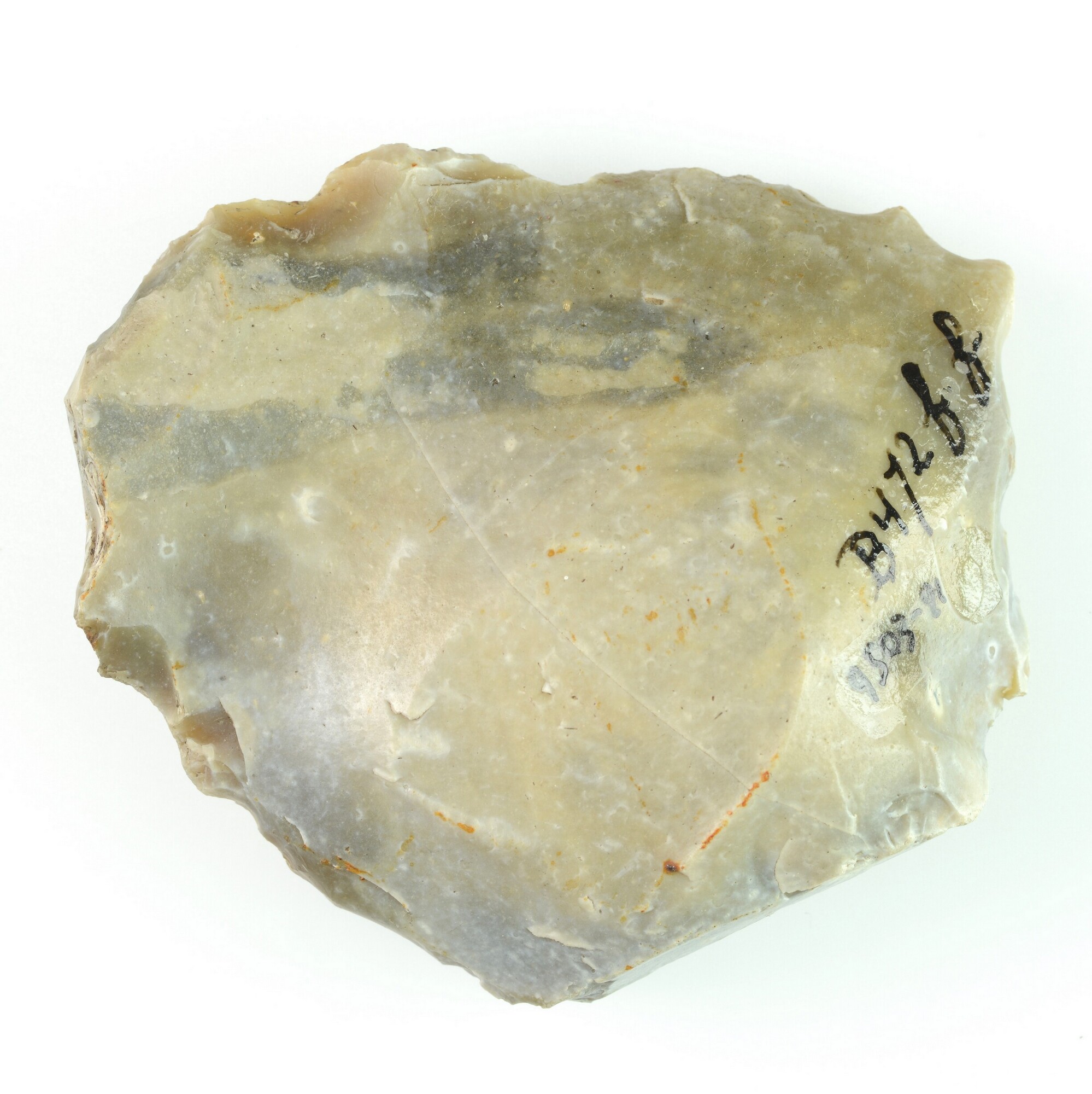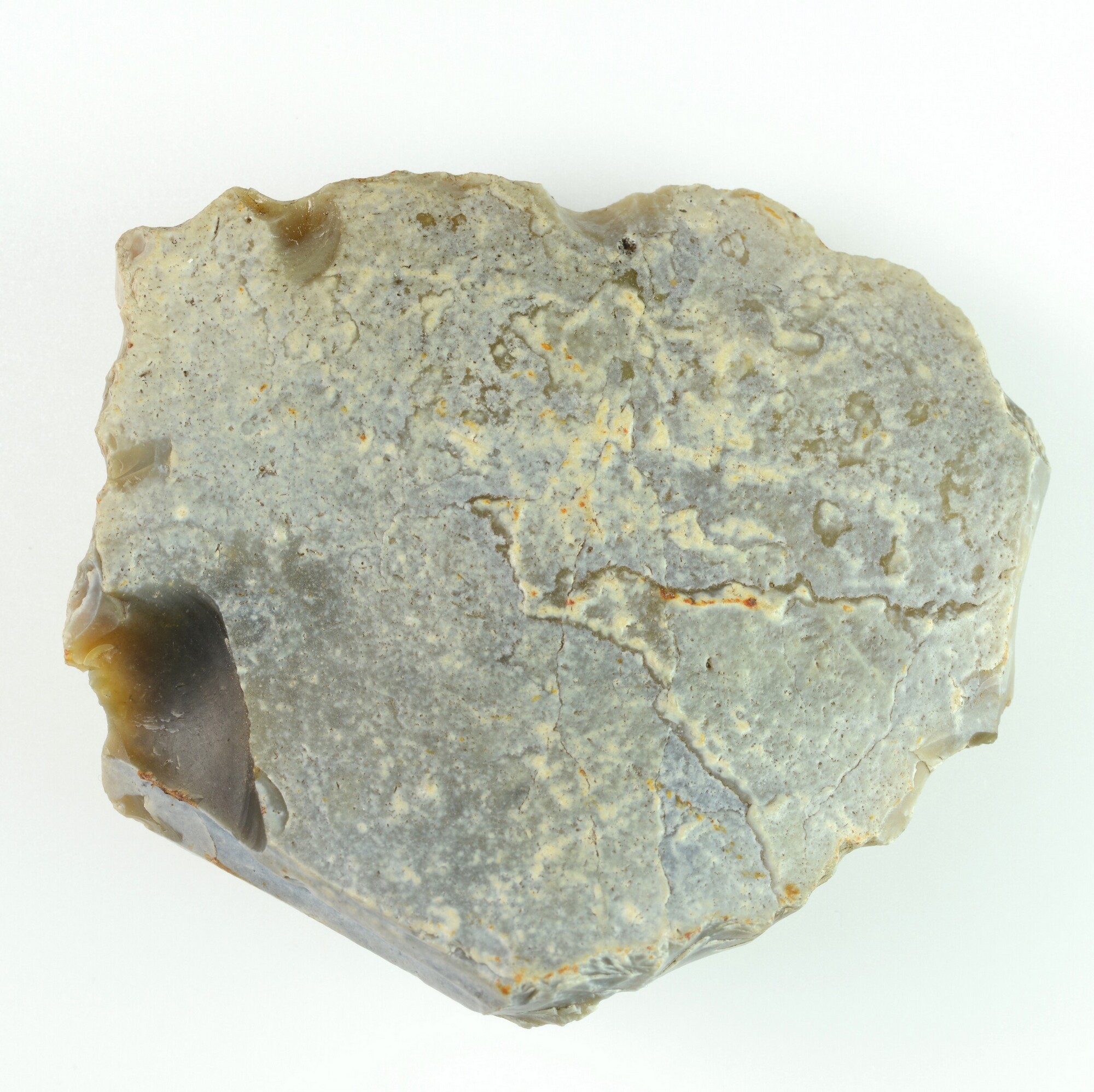 Afslag; grote afslag, dorsaal cortex, retouchering gedeeltelijk langs distaal einde en zijdelings; witte patina; grijze vuursteen; x-coördinaat: 138.455/ y-coördinaat: 471.420