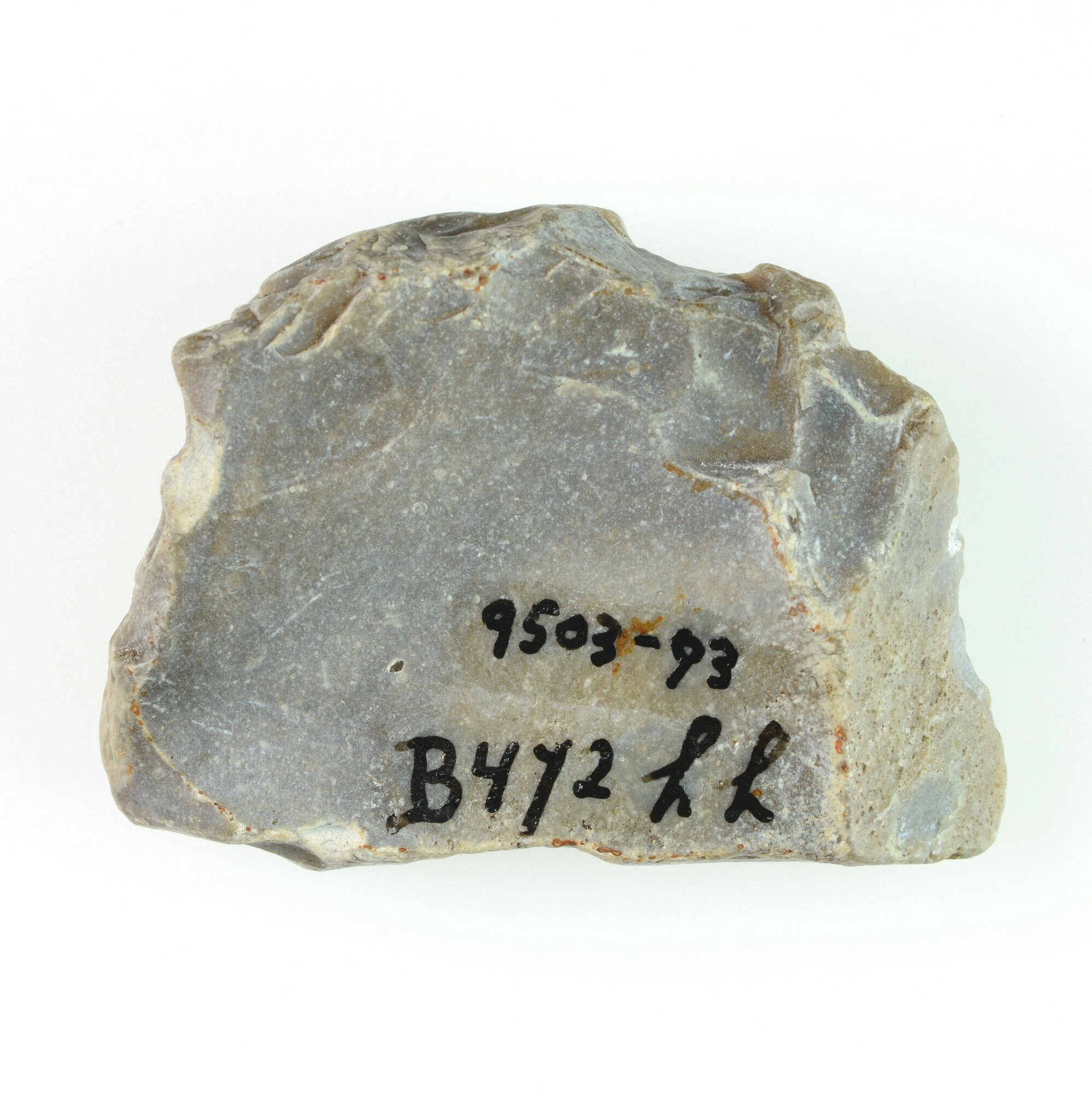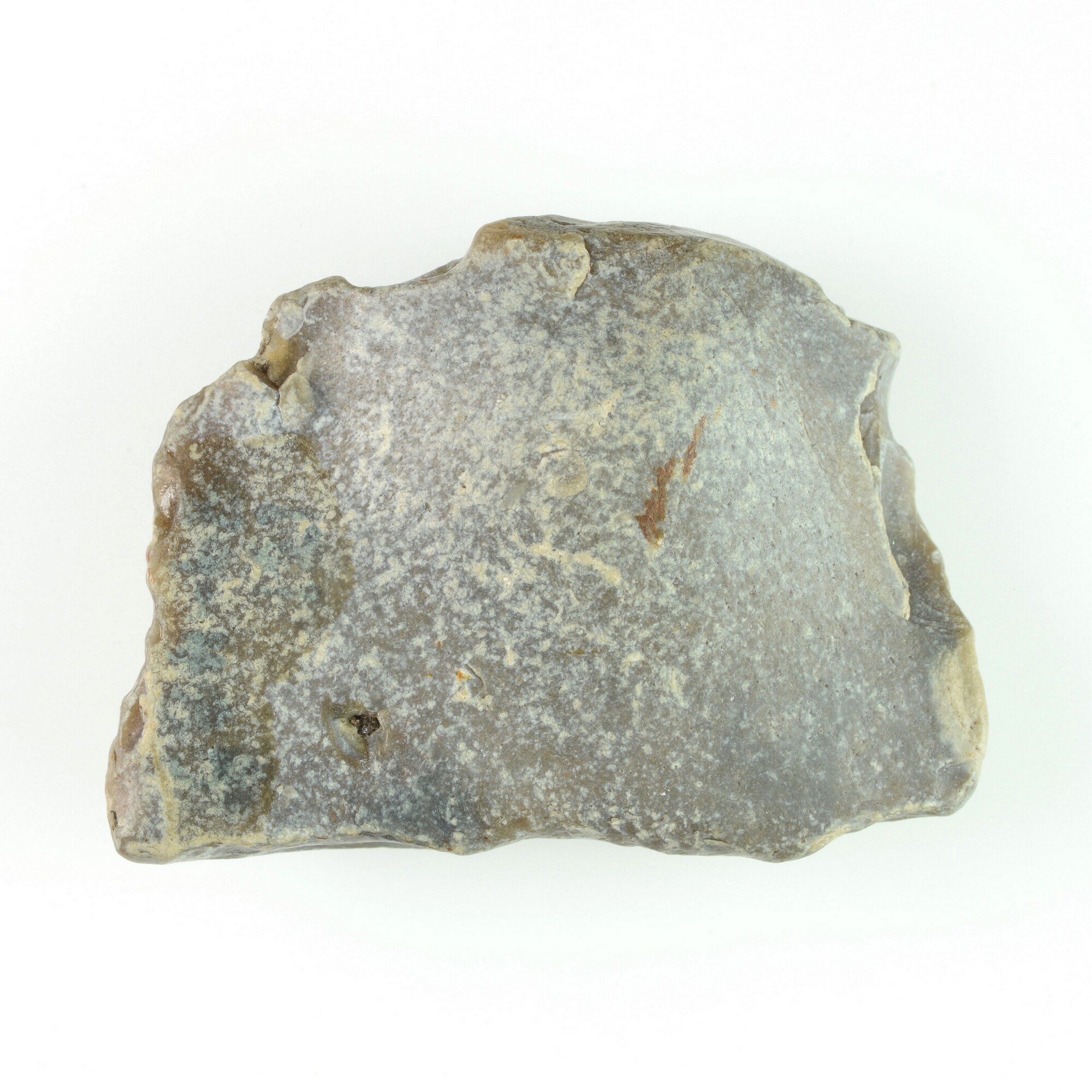 Afslag; rechte zijschaaf op brede afslag met vier dorsale negatieven; witte patina; grijs vuursteen