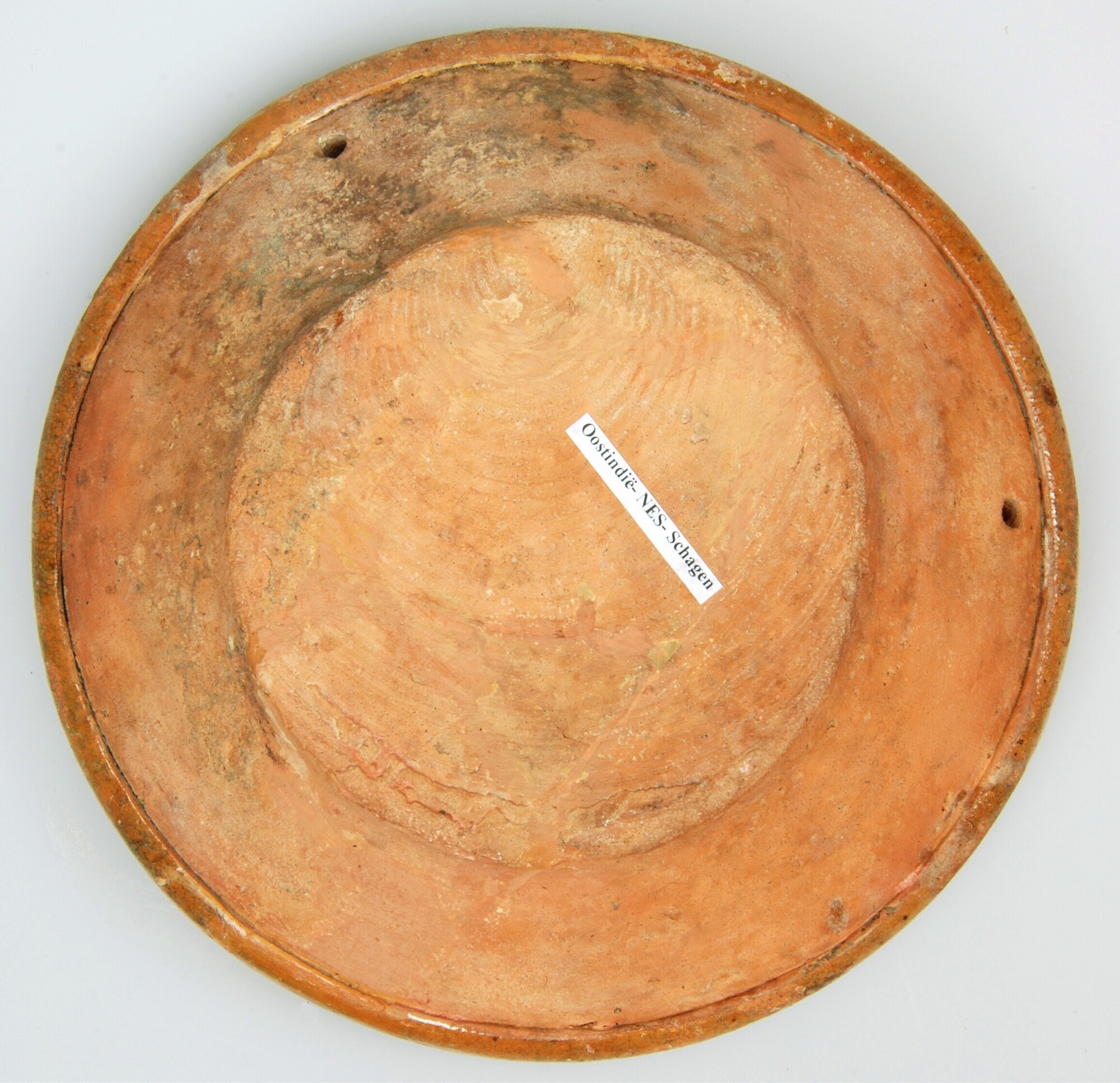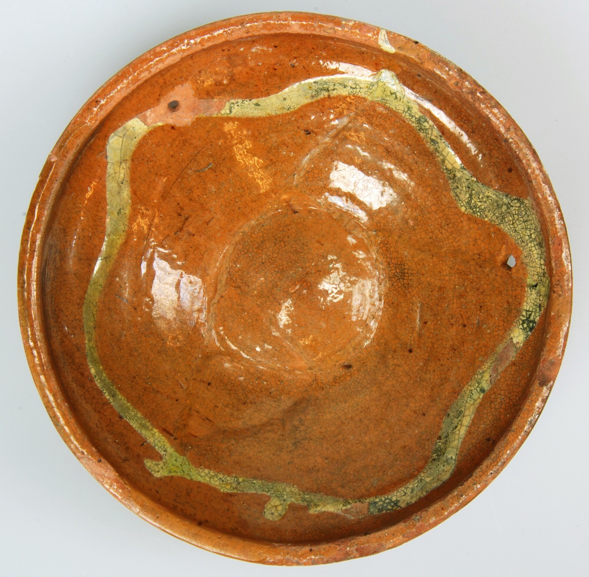 Bord; r-bor-28; roodbakkend; diep afgerond bord met kraagrand; inwendig loodglazuur, slibversiering; vl: slordige golflijn; standvlak; twee gaten in de wand; Nederrijns