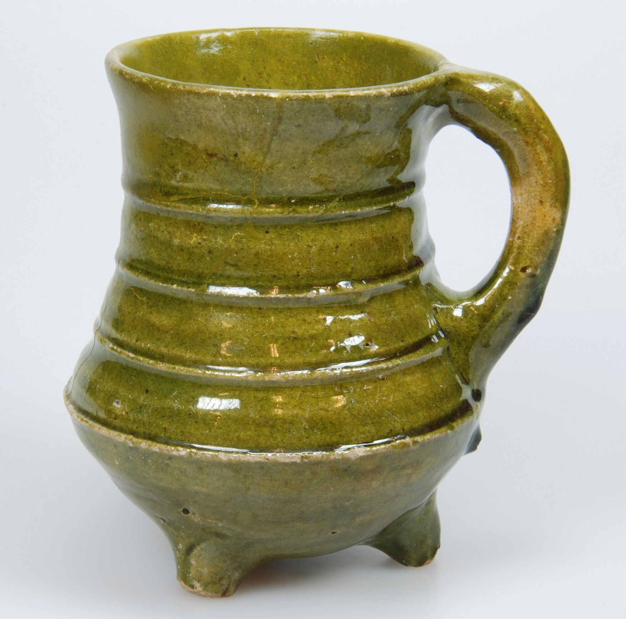 Grape; w-gra-13; hoge grape met scherpe buikknik en iets uitgebogen rand en ribbels op buik, drie poten; verticaal worstoor; witbakkend aardewerk; loodglazuur met koperoxide; herkomst: West-Nederland