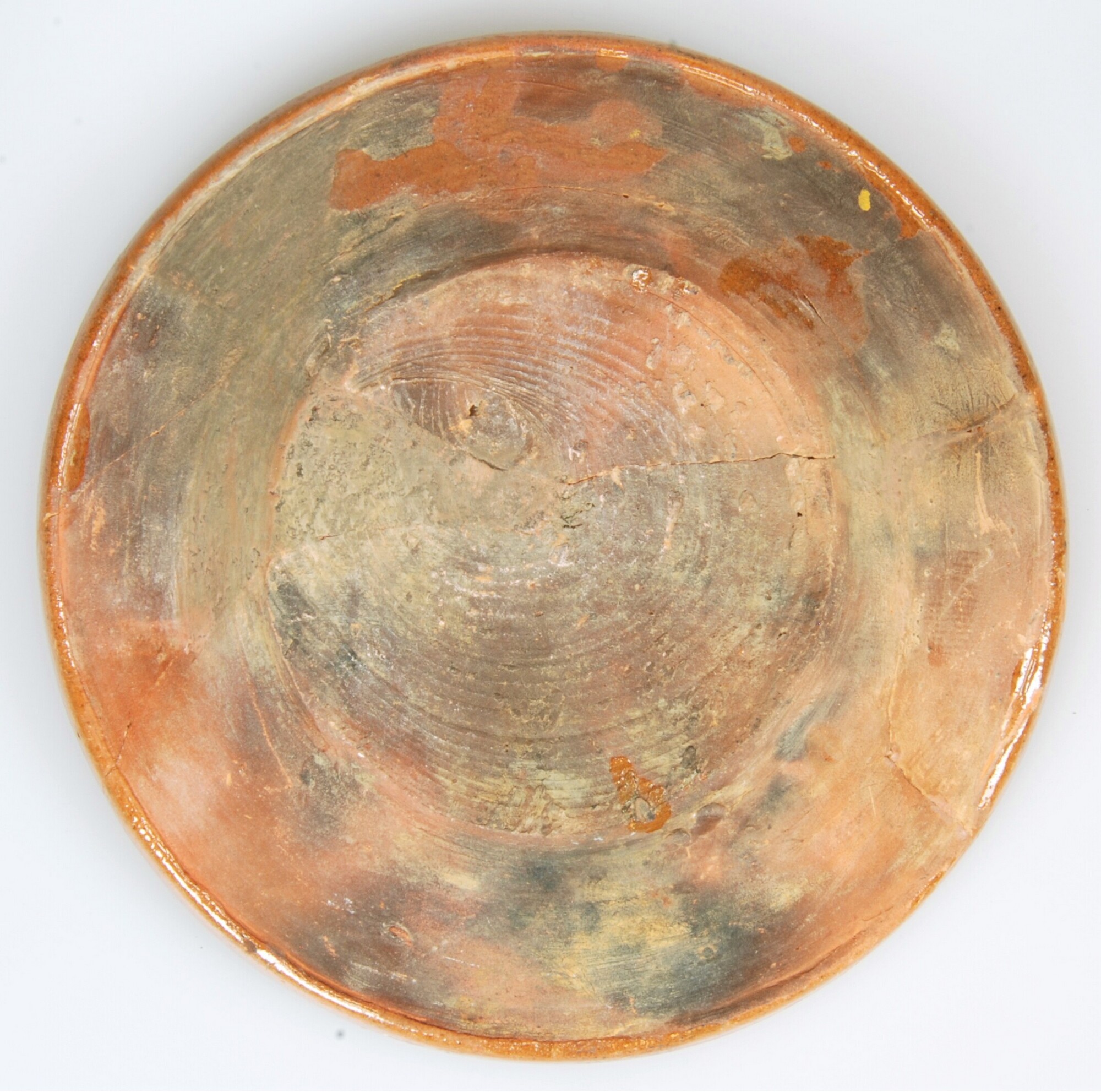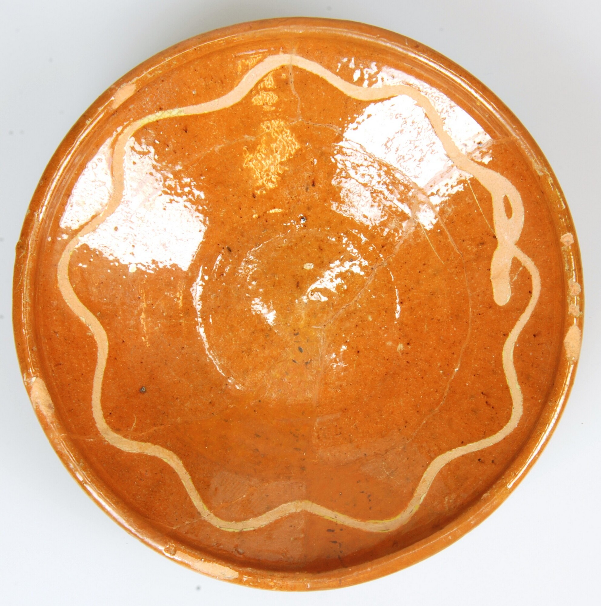 Bord; r-bor-28; roodbakkend; diep afgerond bord met kraagrand; inwendig loodglazuur, slibversiering; vl: slordige golflijn (geel glazuur heeft losgelaten); standvlak; herkomst: Nederrijn