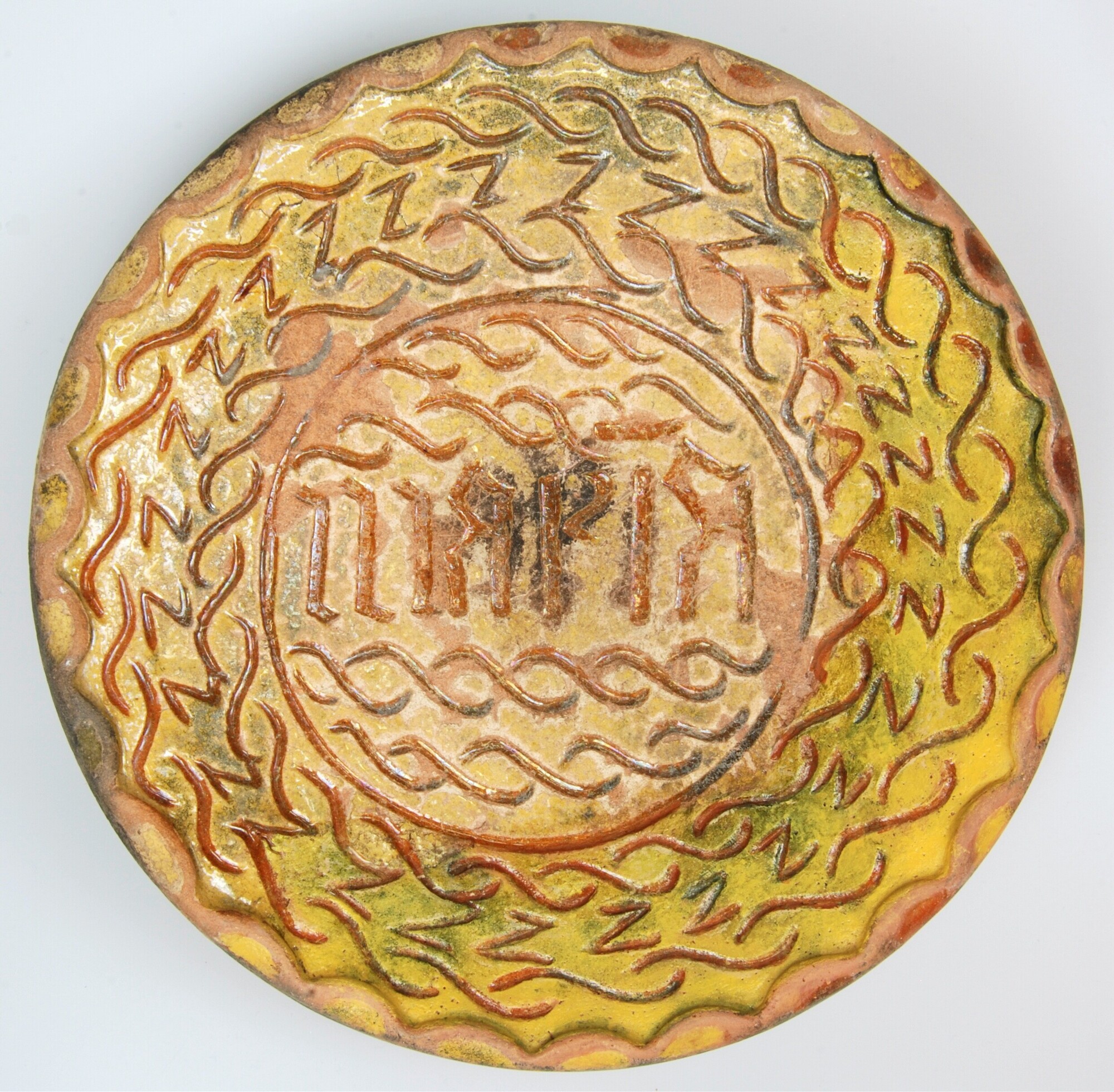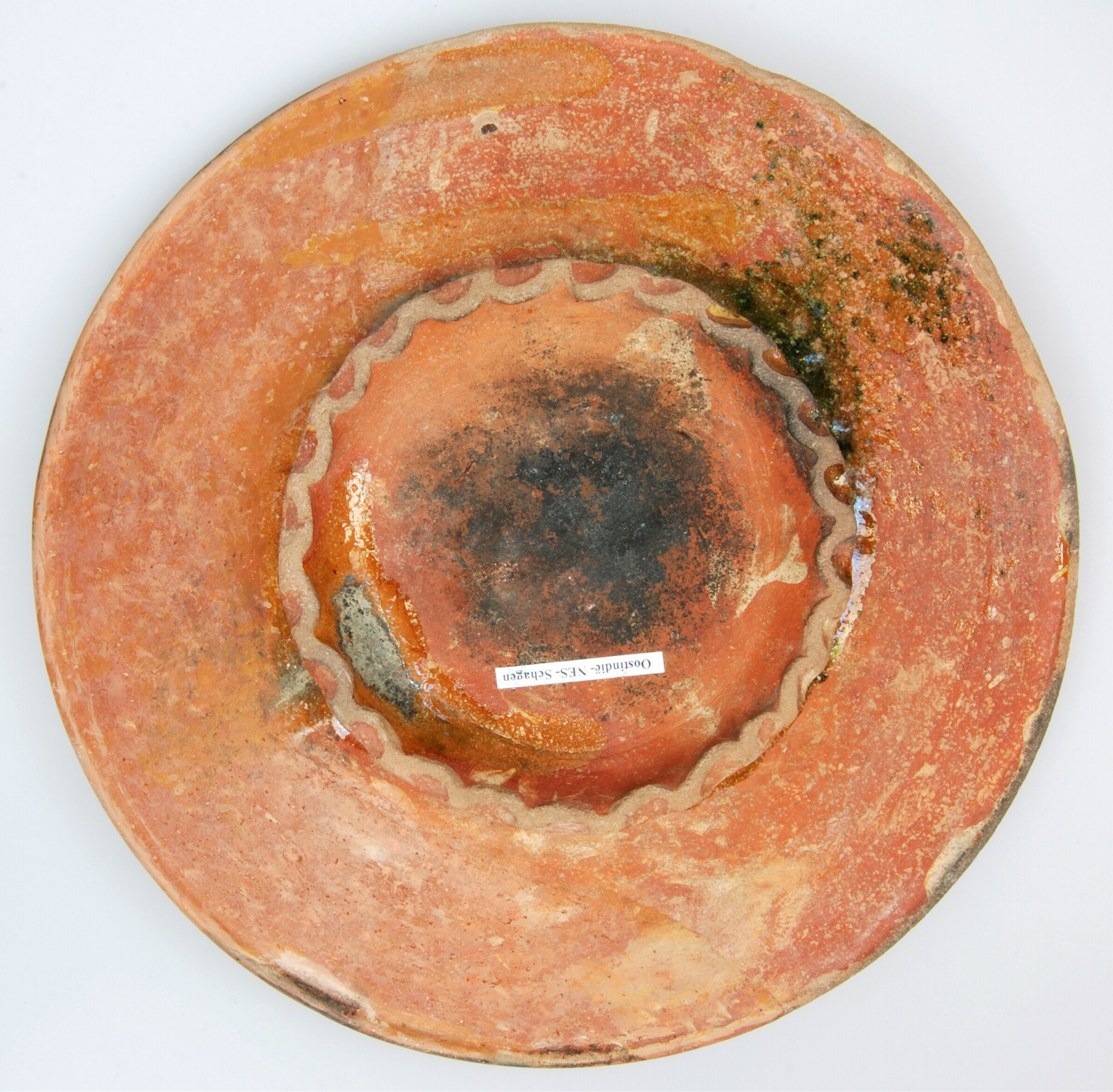 Bord; r-bor-18; bord met holle spiegel en naar buiten geknikte platte vlag met van buiten aangedrukte, geknepen rand, geknepen standring; roodbakkend aardewerk; inwendig loodglazuur; slibversiering: witte sliblaag met gekerfde motieven in sgraffito-techniek; spiegel: MARIA met rondom golflijnen; vlag: Z-motieven en golflijnen; achterzijde beroet; herkomst: Noordelijke Nederlanden