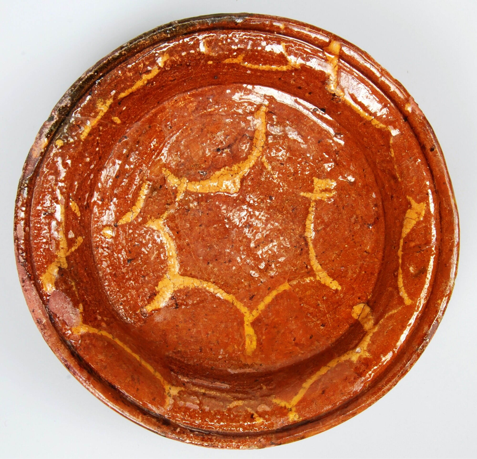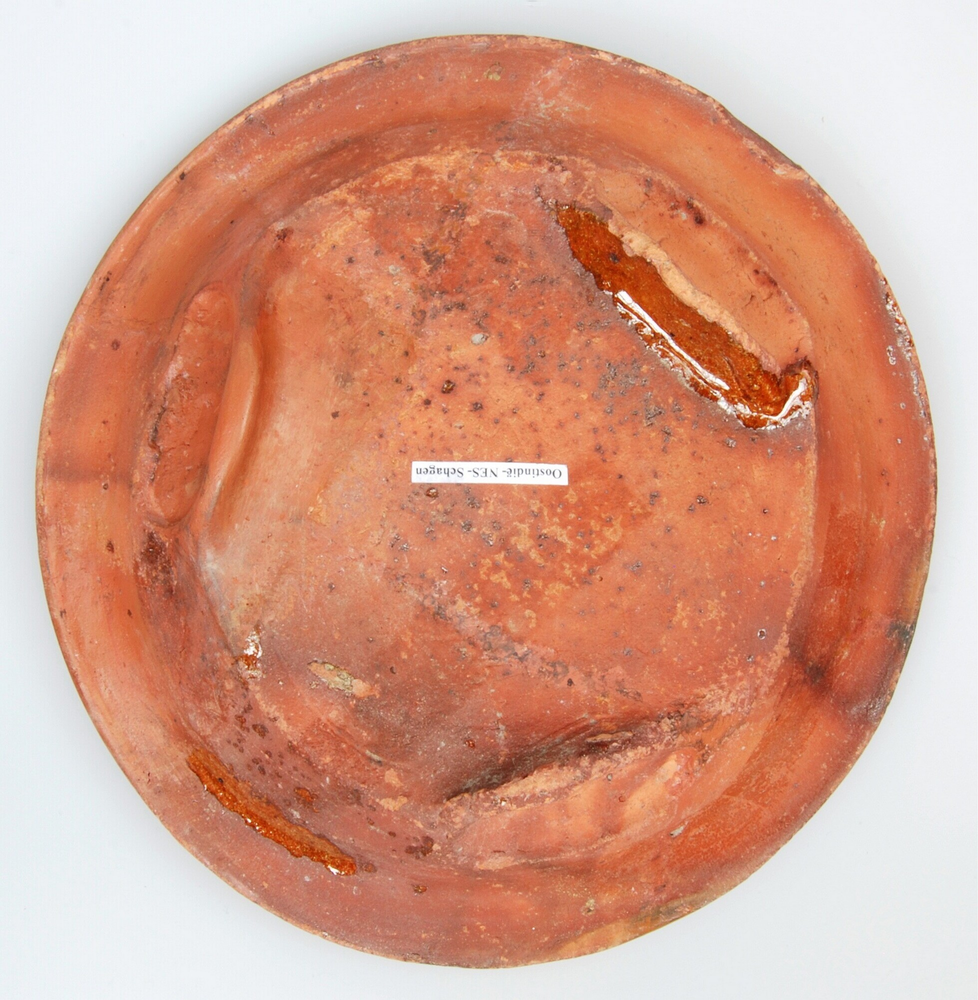 Bord; r-bor-1; Bord met uitgebogen vlag en van buiten aangedrukte rand; roodbakkend; inwendig loodglazuur; slibsikkels op de rand en zeshoek op de vlag; 3 standlobben; herkomst: Nederland