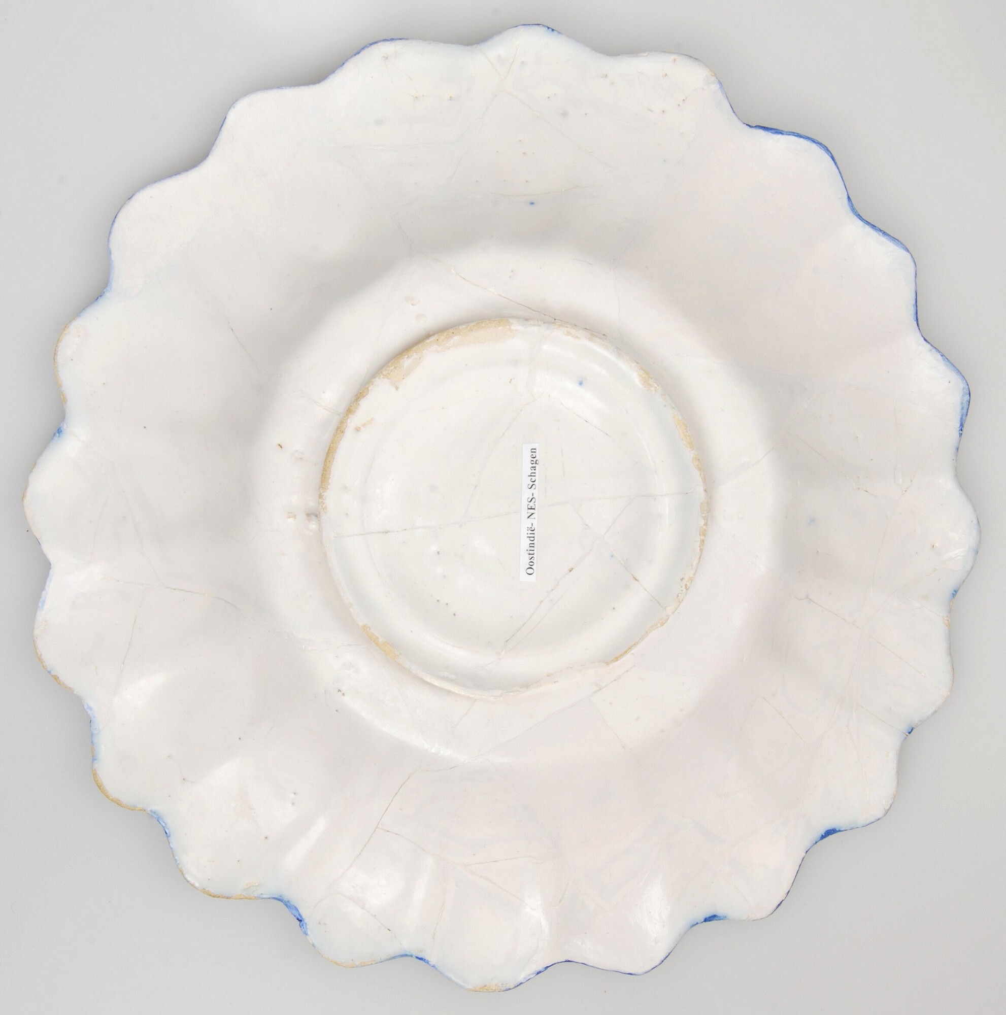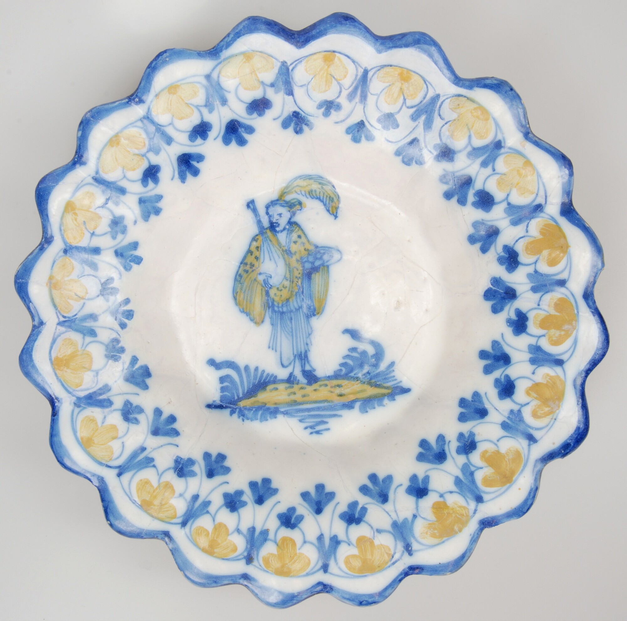 Plooischotel; f-plo-2; plooischotel met knik van spiegel naar vlag, plooien alleen in vlag, standring; Hollandse faience; tinglazuur; blauwe beschildering met gele accenten, spiegel: Chinees figuur met muziekinstrument in landschap, vlag: palmetten herkomst: Haarlem of Delft