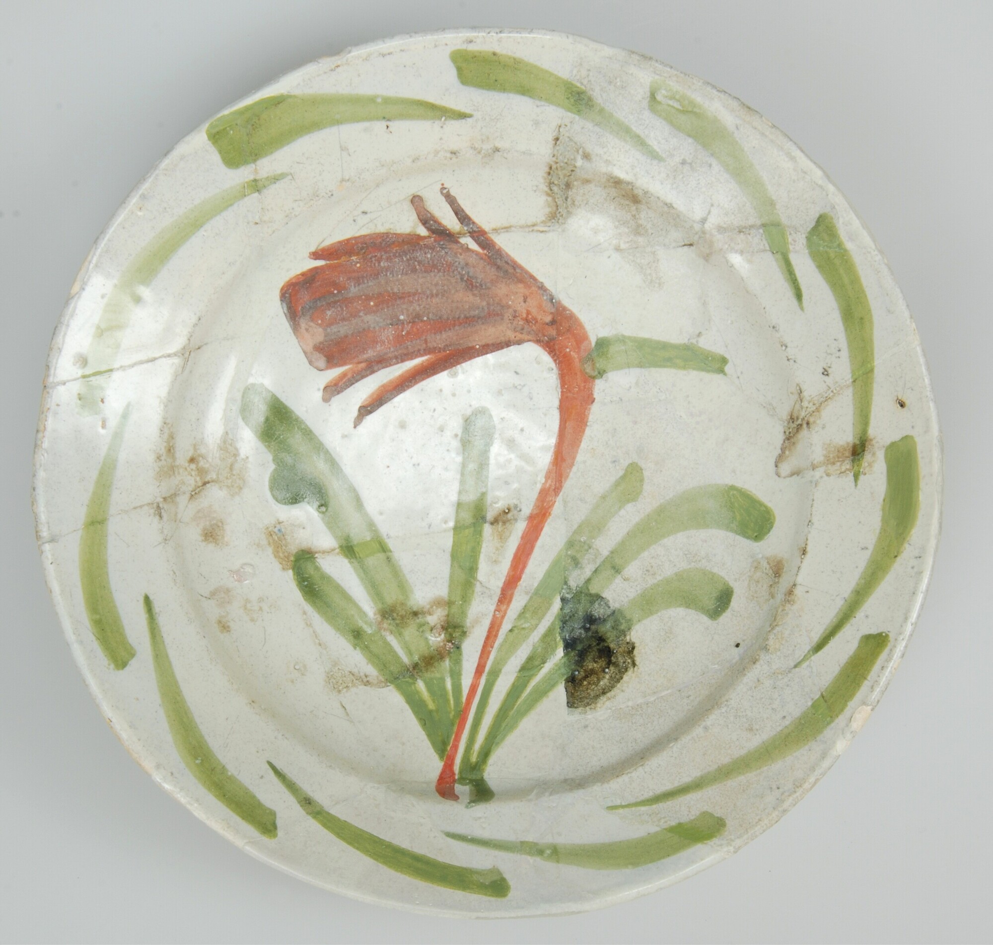 Bord; f-bor-3; afgerond bord met platte bodem en vrij brede vlag; faience; vl: groene strepen, sp: bloem in de kleuren groen/rood; standvlak