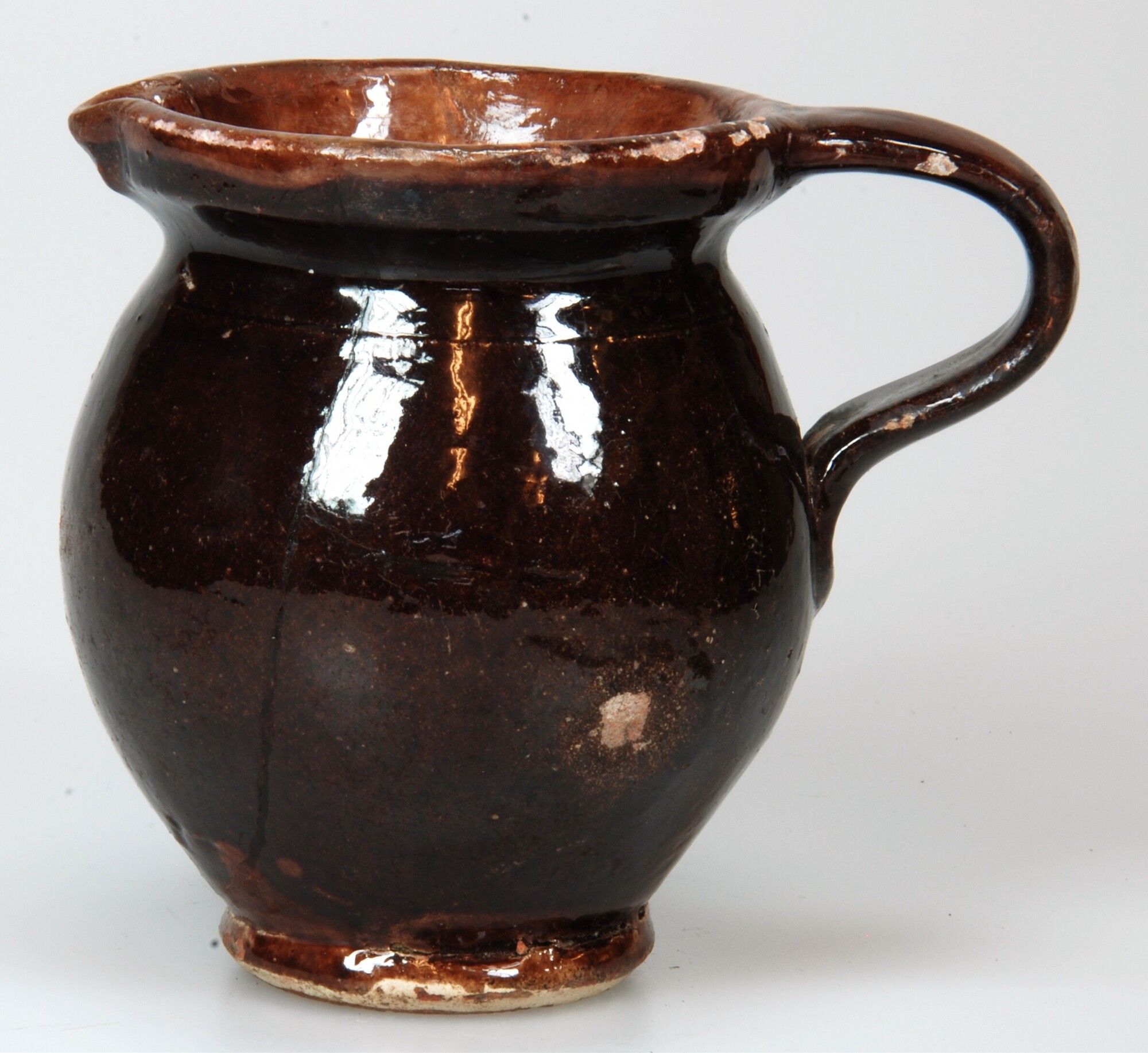 Kan; r-kan-23; bolle kan met kraagrand, standvoet, verticaal lintoor; roodbakkend aardewerk; loodglazuur; inw: witte kleislib, uitw: mangaanoxide; herkomst: Gouda