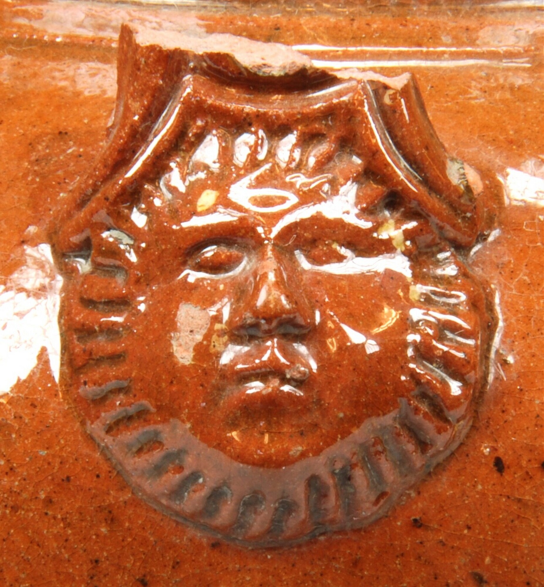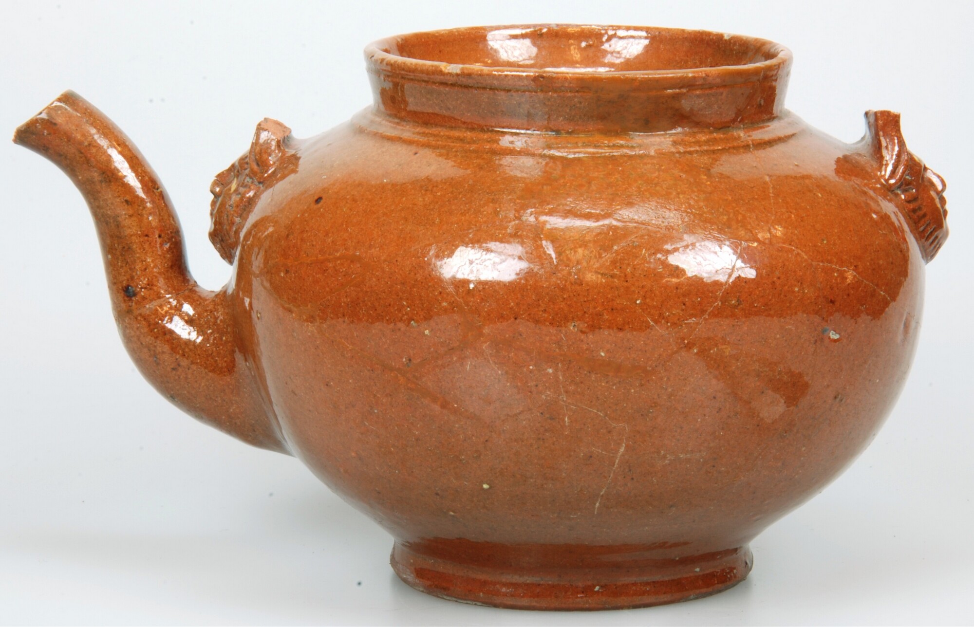 Theepot; r-the-4; bolle theepot met hoge schouder en geknikte opstaande rand met dekselgeul, standvoet; hengsel-ogen met appliques in de vorm van een gezicht; roodbakkend aardewerk; herkomst: Nederland