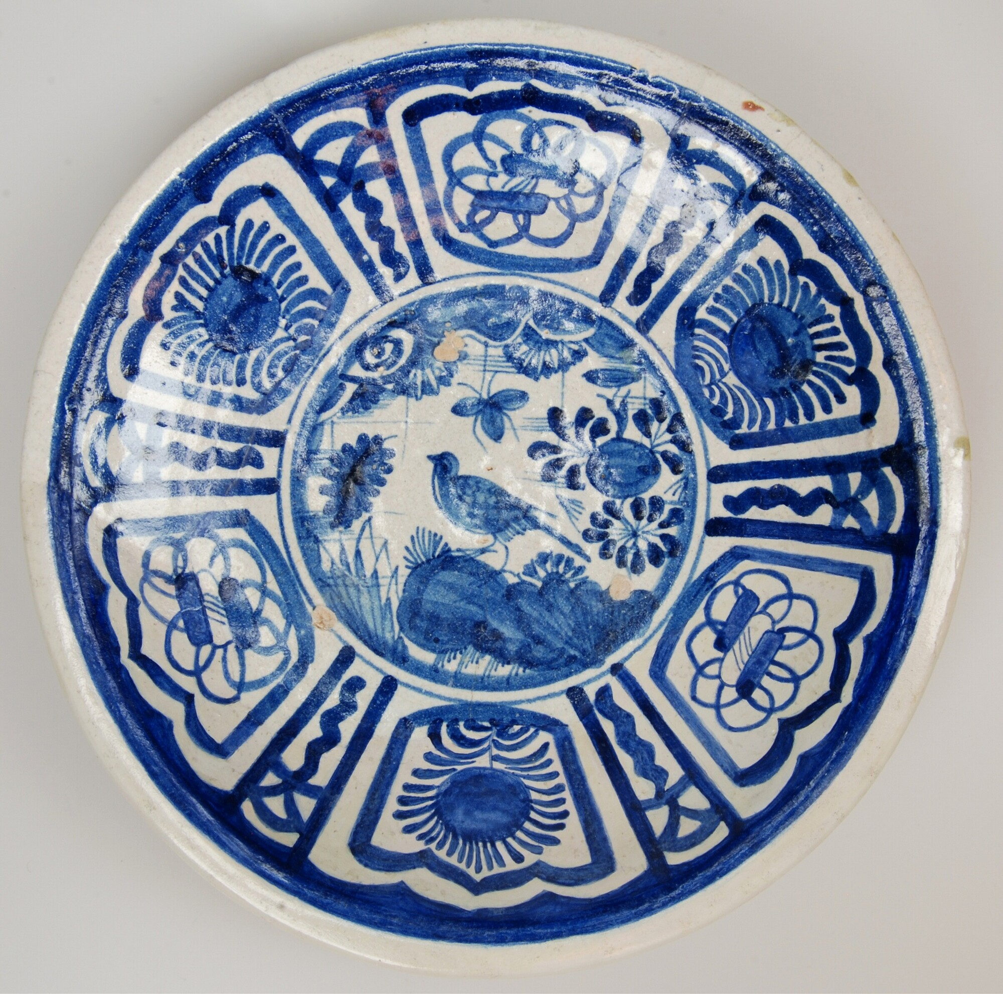 Bord; m-bor-5; afgerond bord met uitgebogen rand, standring; Hollandse majolica (imitatie kraakporselein); inwendig tinglazuur, uitwendig loodglazuur; blauwe beschildering, spiegel: vogel in tuin, vlag: boeddhistische symbolen binnen panelen; herkomst: West-Nederland