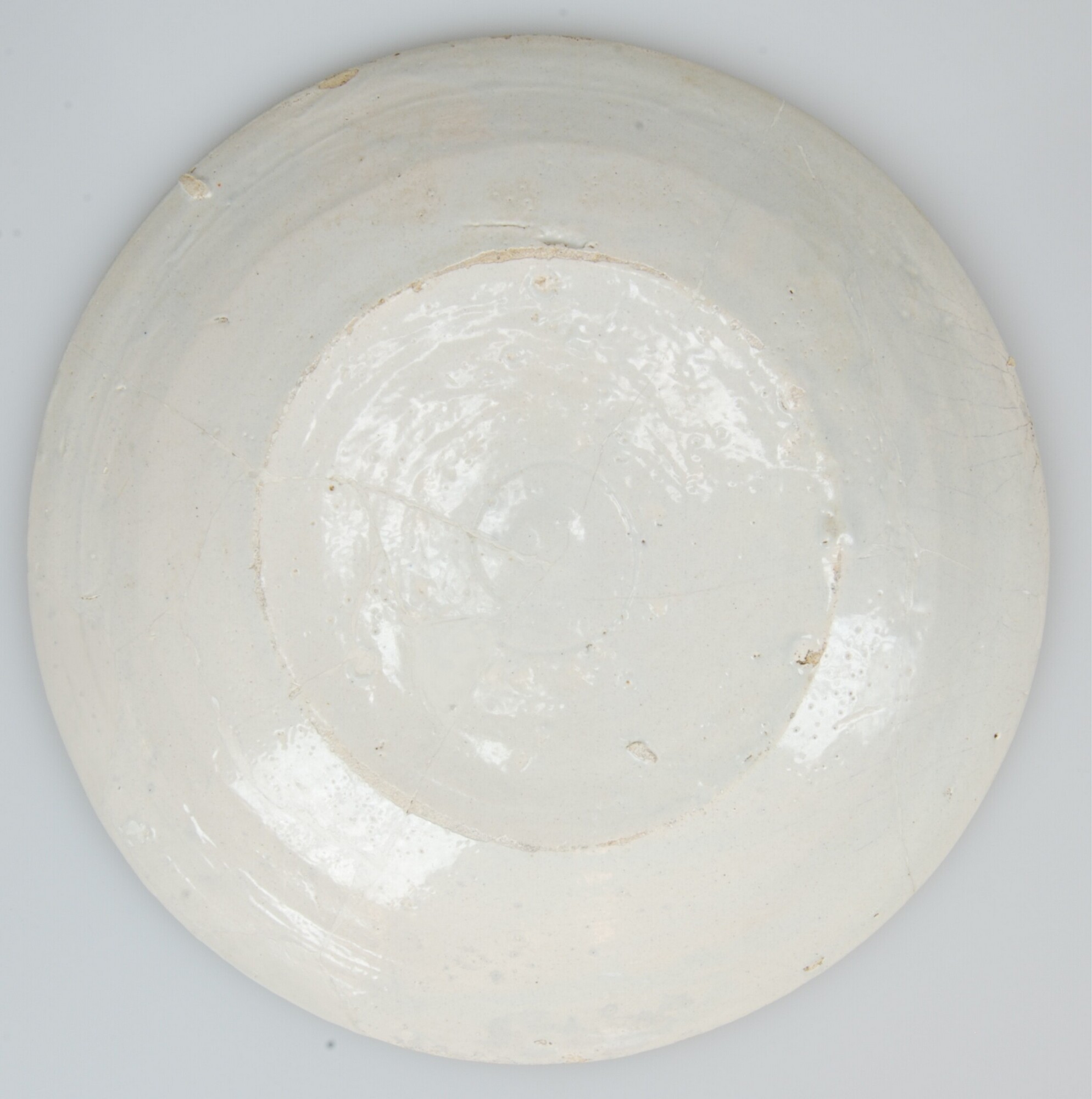 Bord; f-bor-5; afgerond bord met platte bodem en smalle vlag; faience; tinglazuur; blauw op wit: centrale rozet op spiegel; cirkel op rand; standvlak; herkomst: Nederland