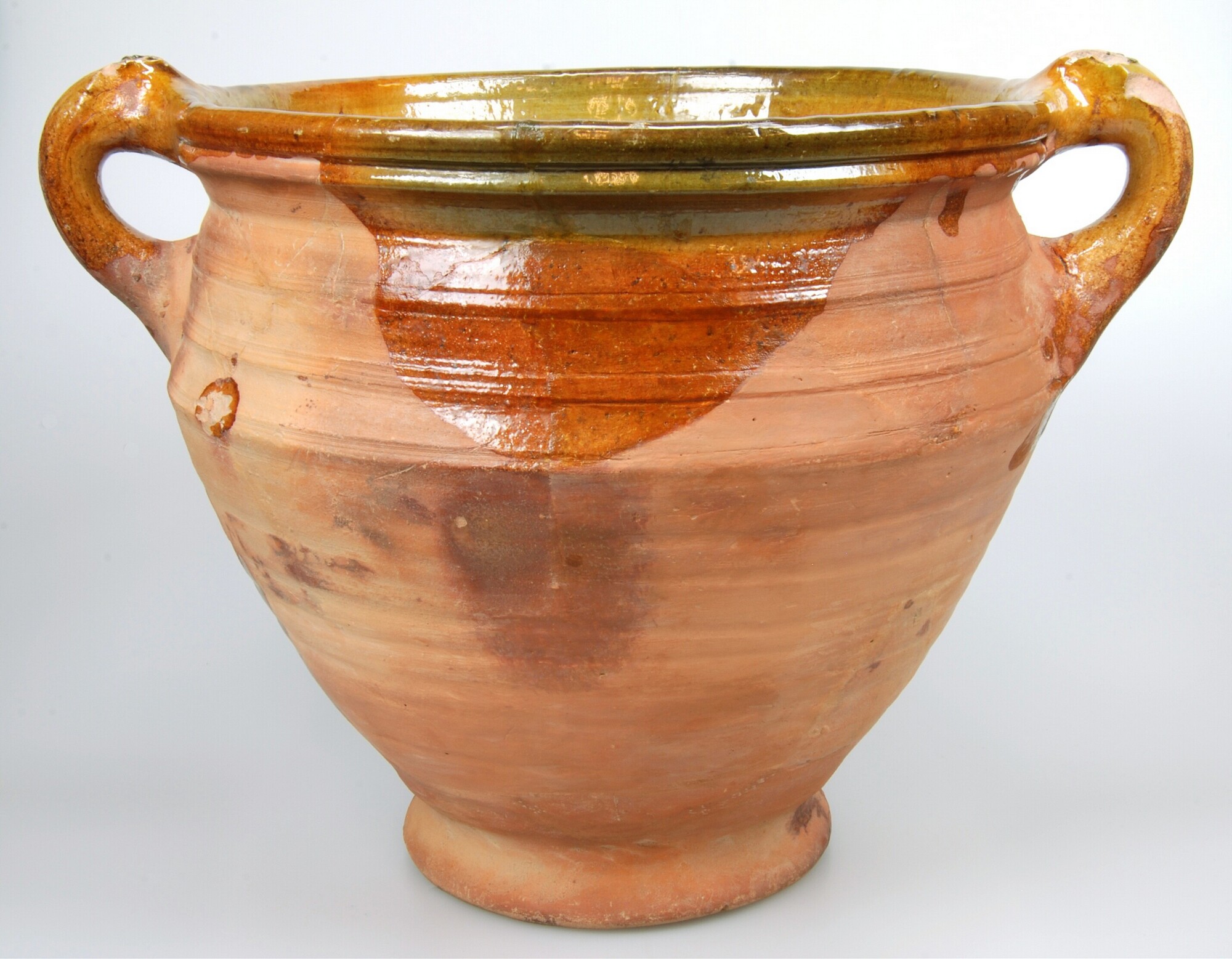Pot; r-pot-27; pot met schouderknik en wijde hals met klein kraagrandje; roodbakkend; loodglazuur, buitenzijde spaarzaam; drie draairibbels onder de rand; twee verticale worstoren; standring