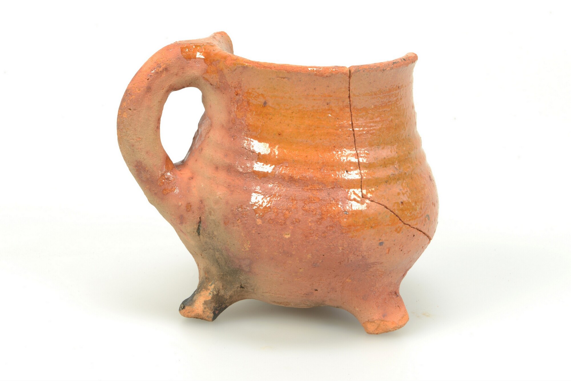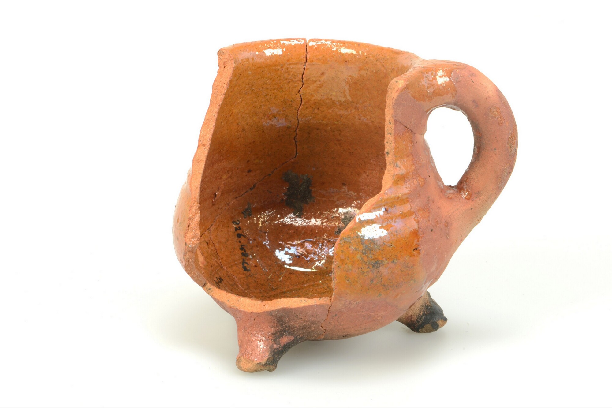 Grape; r-gra-22; hoge grape met afgeronde buik en meerdere ribbels op wand, rechte rand; roodbakkend; inwendig loodglazuur, uitwendig spaarzaam loodglazuur; driepoot; één verticaal worstoor; buitenzijde licht beroet