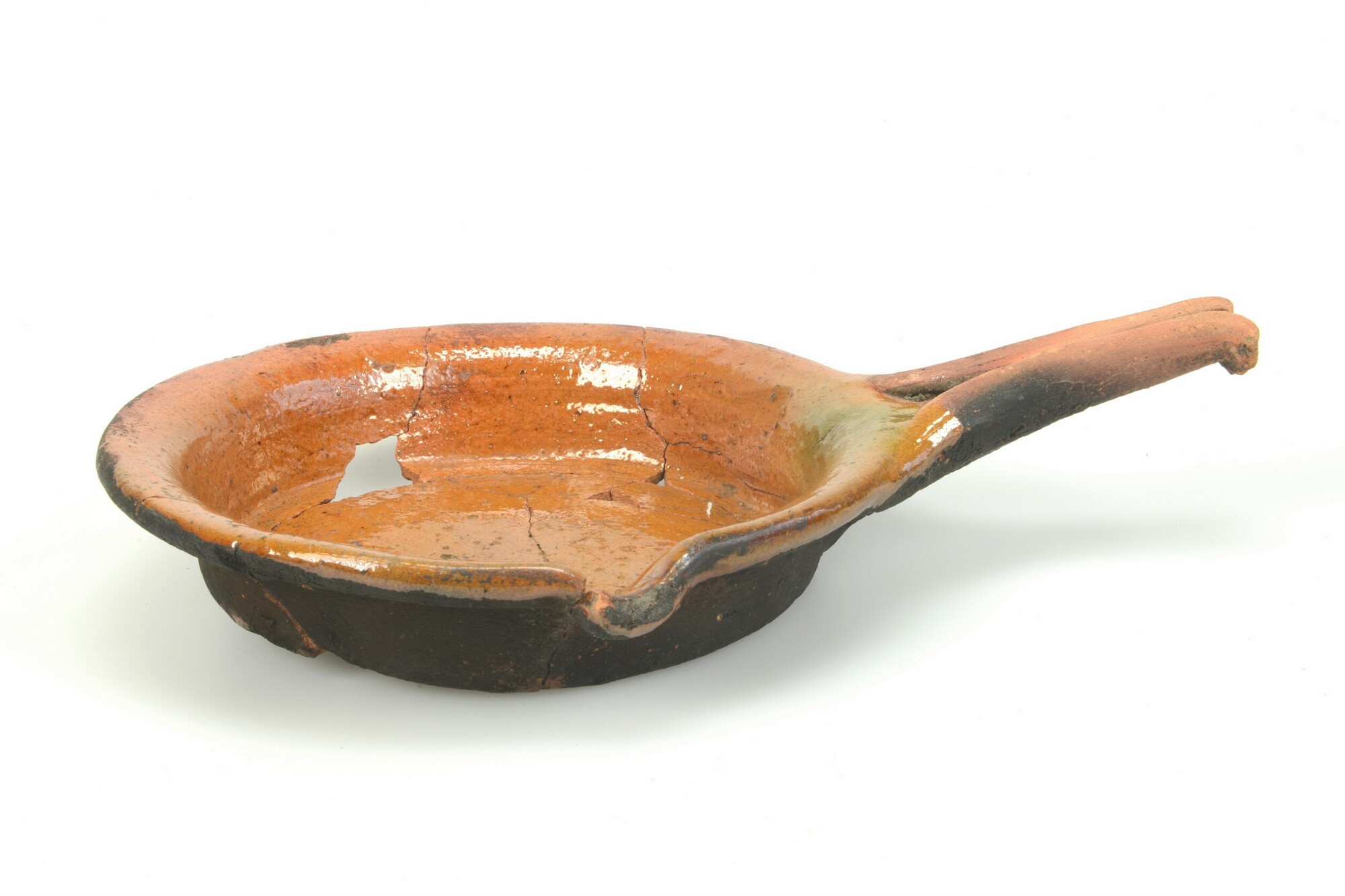 Steelpan; r-bak-1; bakpan met zijwand en ronde rand; roodbakkend; spaarzaam loodglazuur met groene vlek; toegeknepen steel; standvlak; schenklip 90 graden t.o.v. steel; buitenzijde beroet