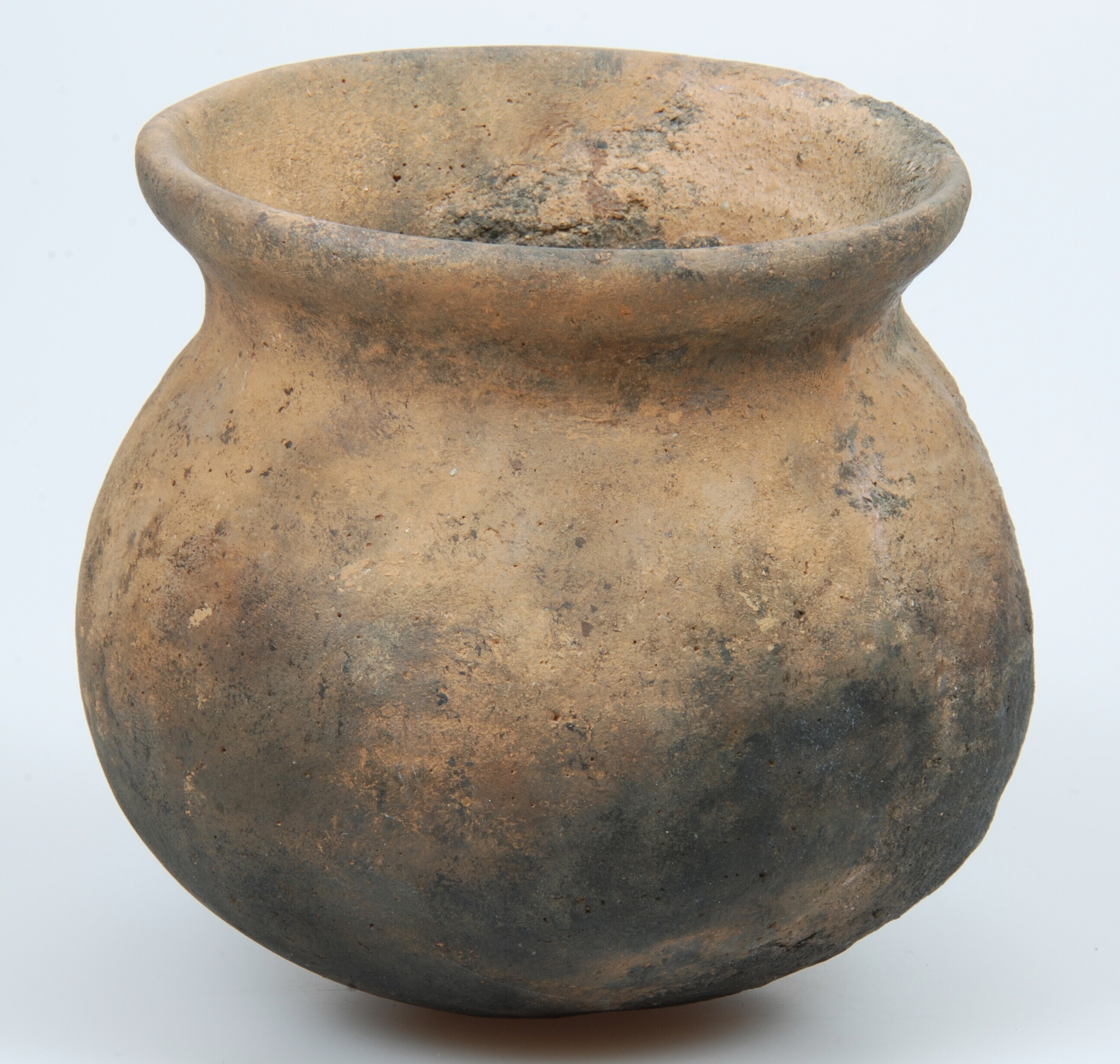 Kogelpot; kp-kog-13; kogelpot met korte uitstaande hals en afgeronde rand met dekselgeul; type H IA-1; kogelpotaardewerk met steengruis-magering; bodem beroet; herkomst: West- of Noord-Nederland