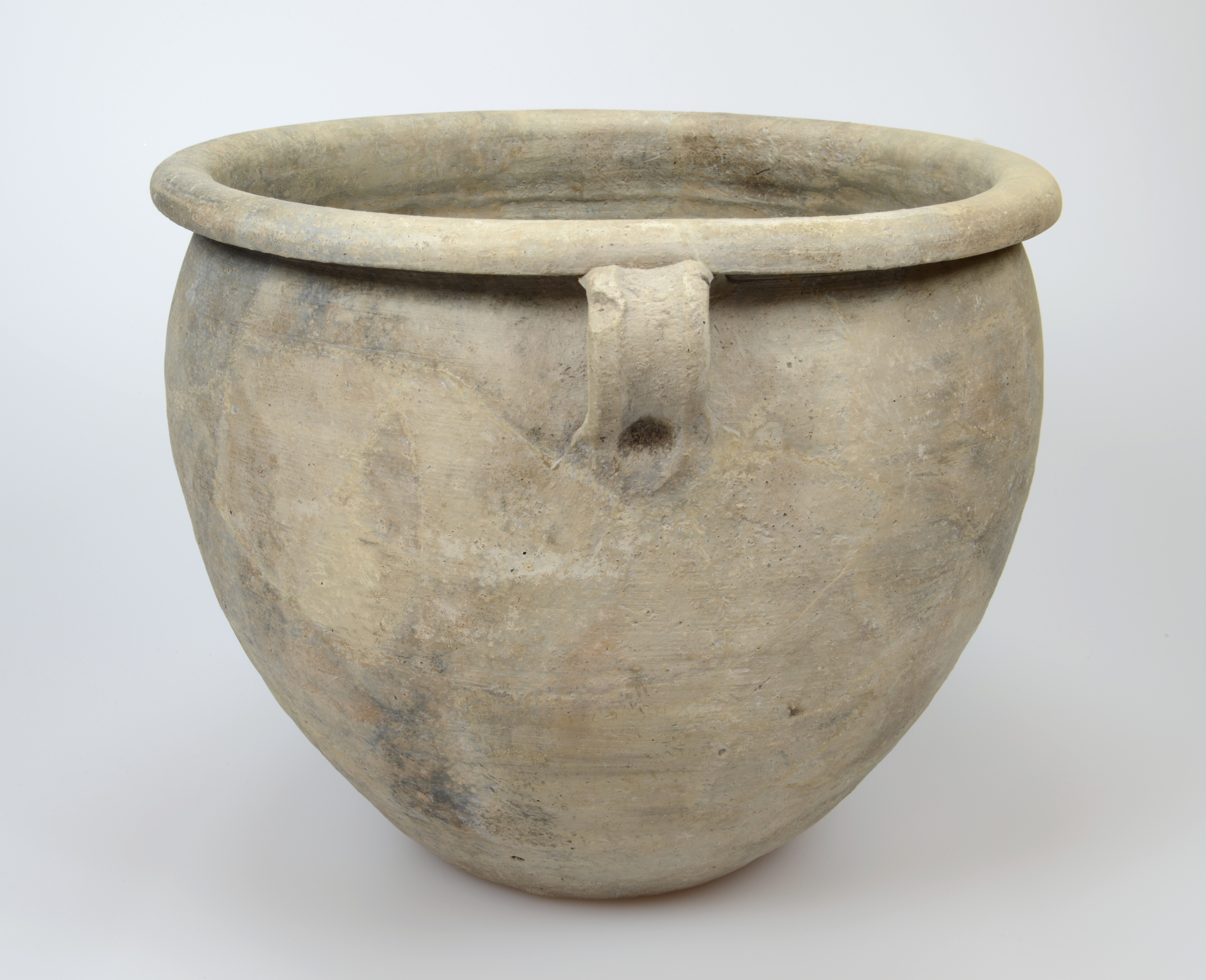 Pot; Wölbwandtöpfe; emmervormige pot met verdikte rand op een plat standvlak met twee verticale bandvormige oren; Merovingisch ruwwandig draaischijfaardewerk; reducerend baksel; grove magering; herkomst: Rijnland