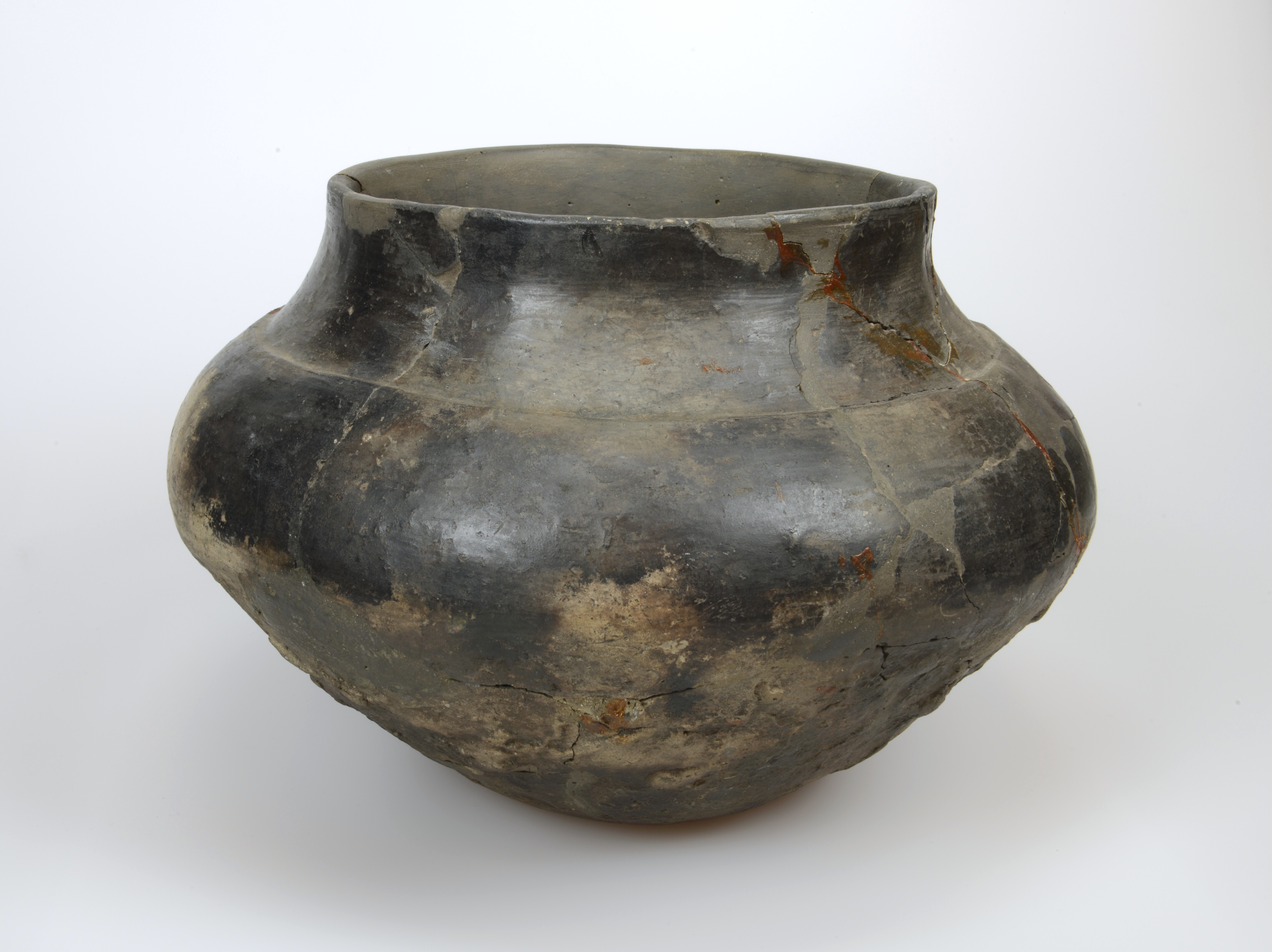 Pot; type Ruinen-Wommels I; wijdmondige pot op standvlak met gepolijst oppervlak en besmeten onderwand. De overgang van schouder naar hals is geaccentueerd met een richel.