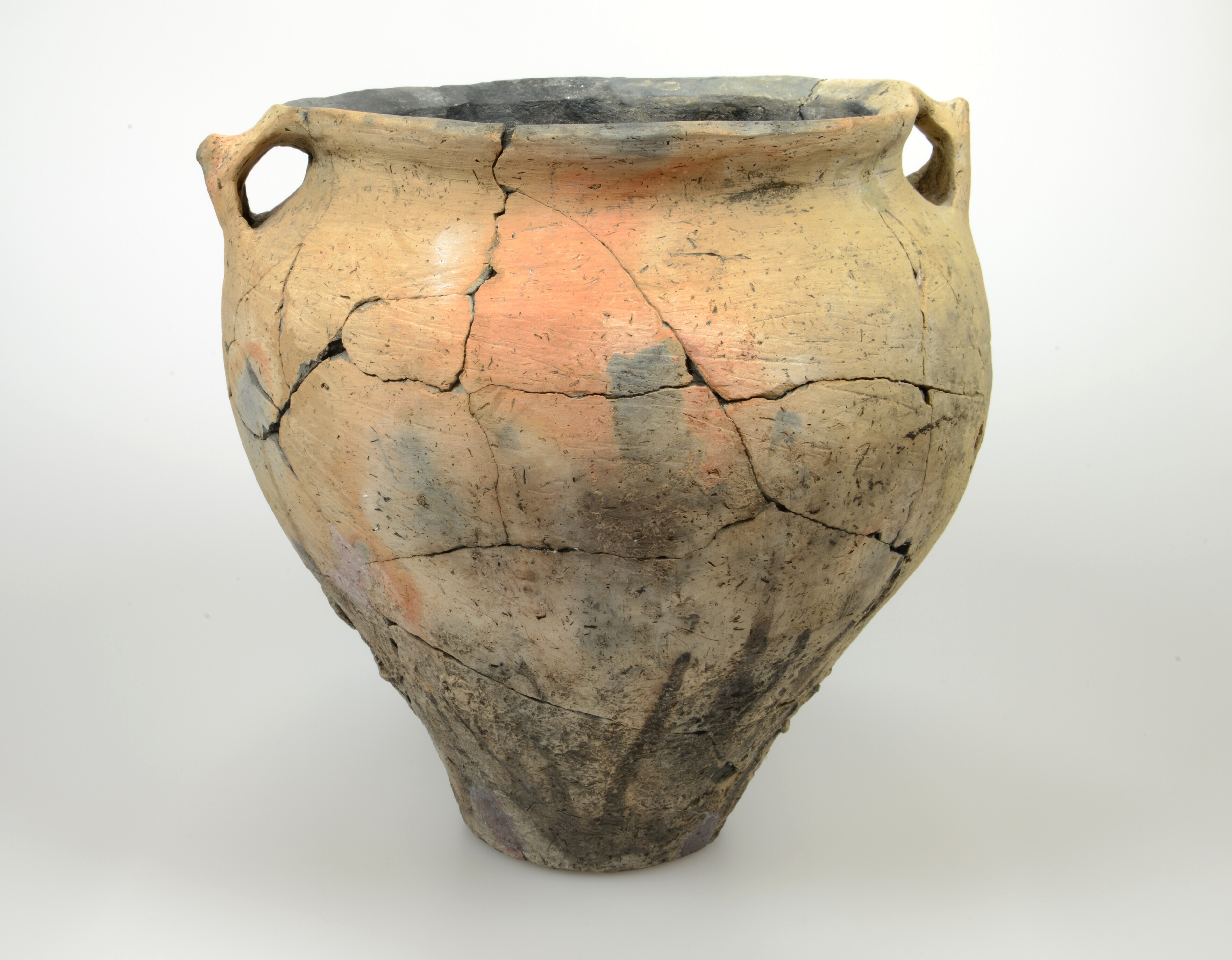 Pot; type Diederik F-III; inheems-romeins aardewerk; nauwmondige pot met twee knobbeloren onder de rand; standvlak; wand besmeten en aangebrachte verticale lijnversiering m.b.v. pigment; organische magering