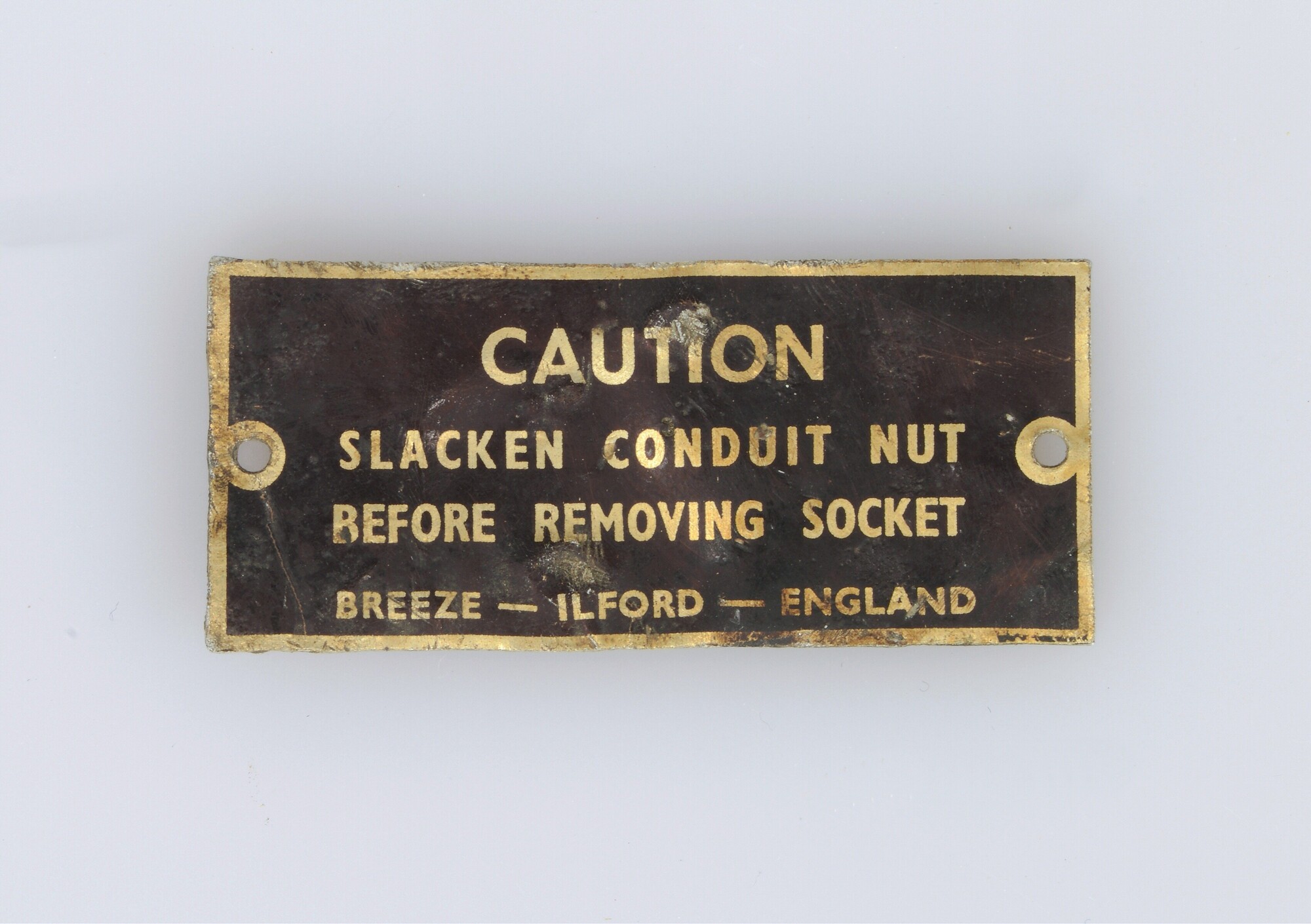 Typeplaatje; rechthoekig plaatje met twee gaten; tekst: CAUTION. SLACKEN CONDUIT NUT. BEFORE REMOVING SOCKET. BREEZE-ILFORD-ENGLAND; herkomst: Groot-Brittanië