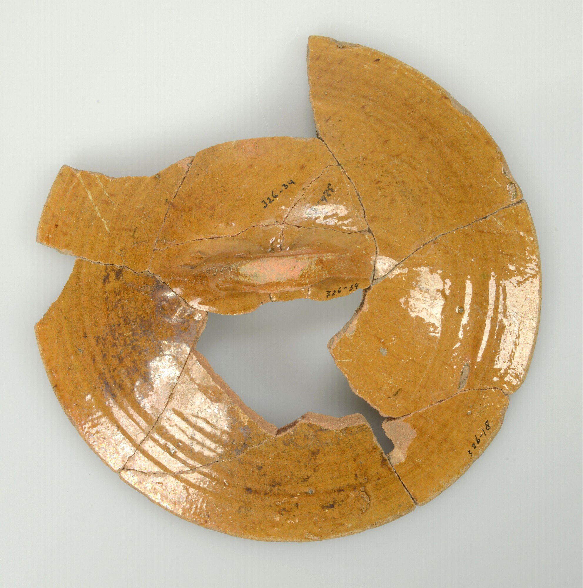 Deksel; r-dek-13; deksel met oor, binnenzijde rand plat; roodbakkend aardewerk; bovenzijde loodglazuur; één oor