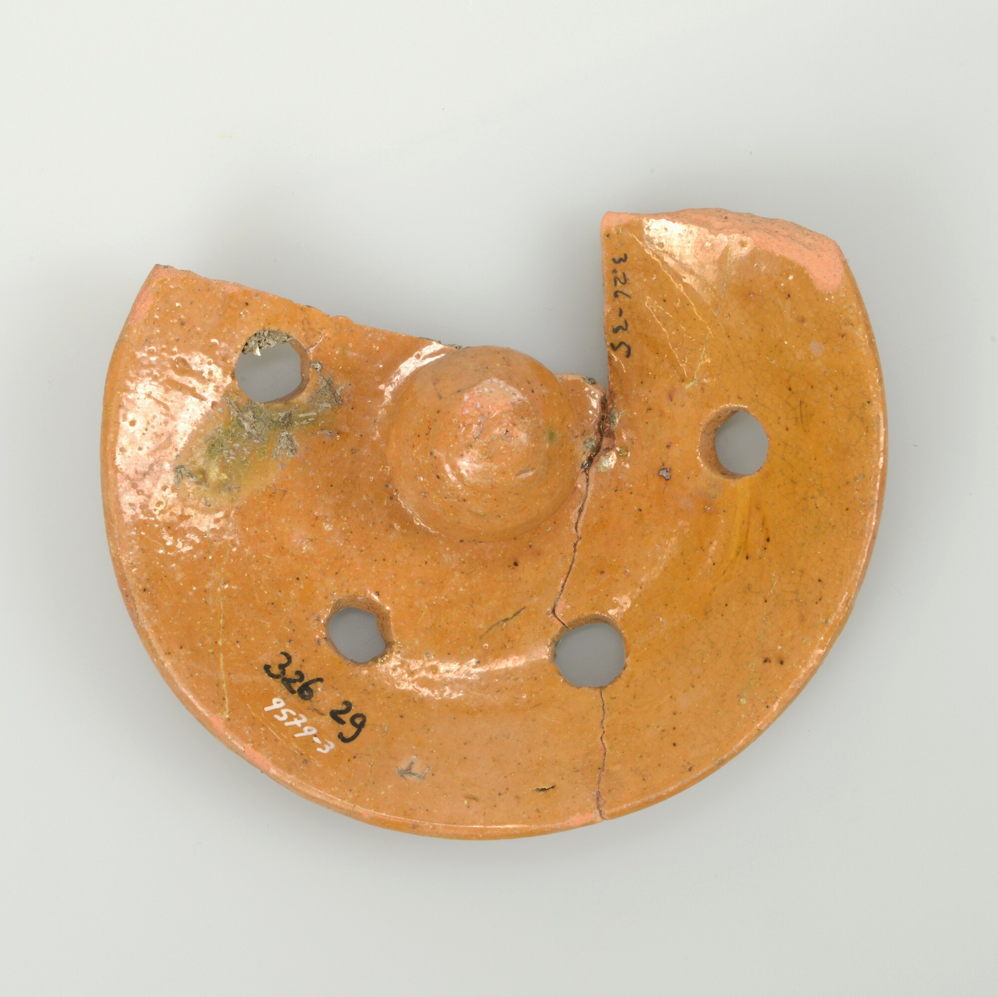 Deksel; r-dek-29; deksel met knop en opstaande rand; roodbakkend aardewerk; bovenzijde loodglazuur; vijf luchtgaten (één ontbreekt)