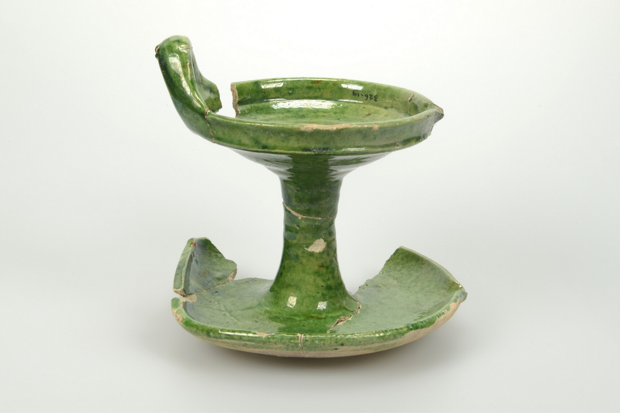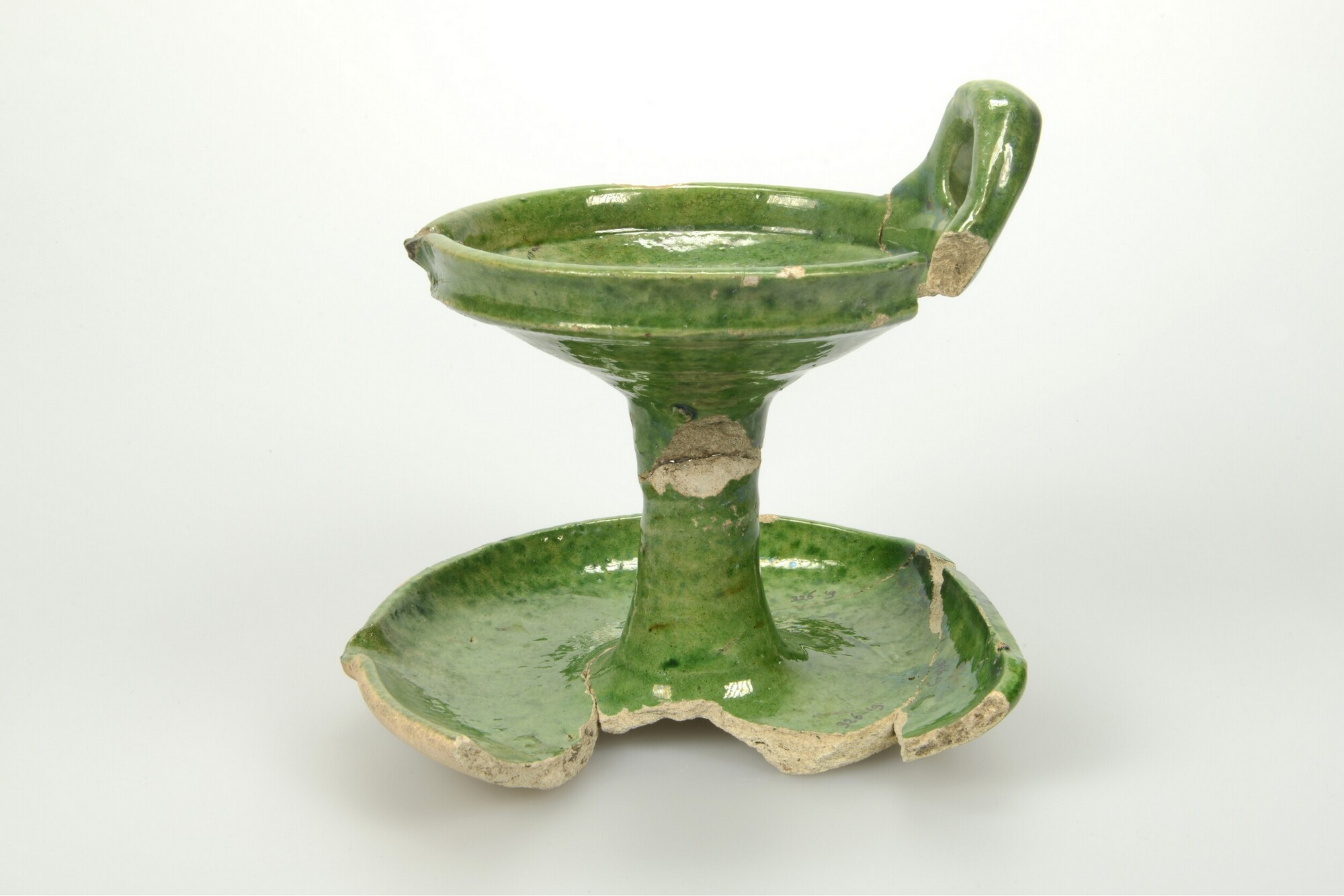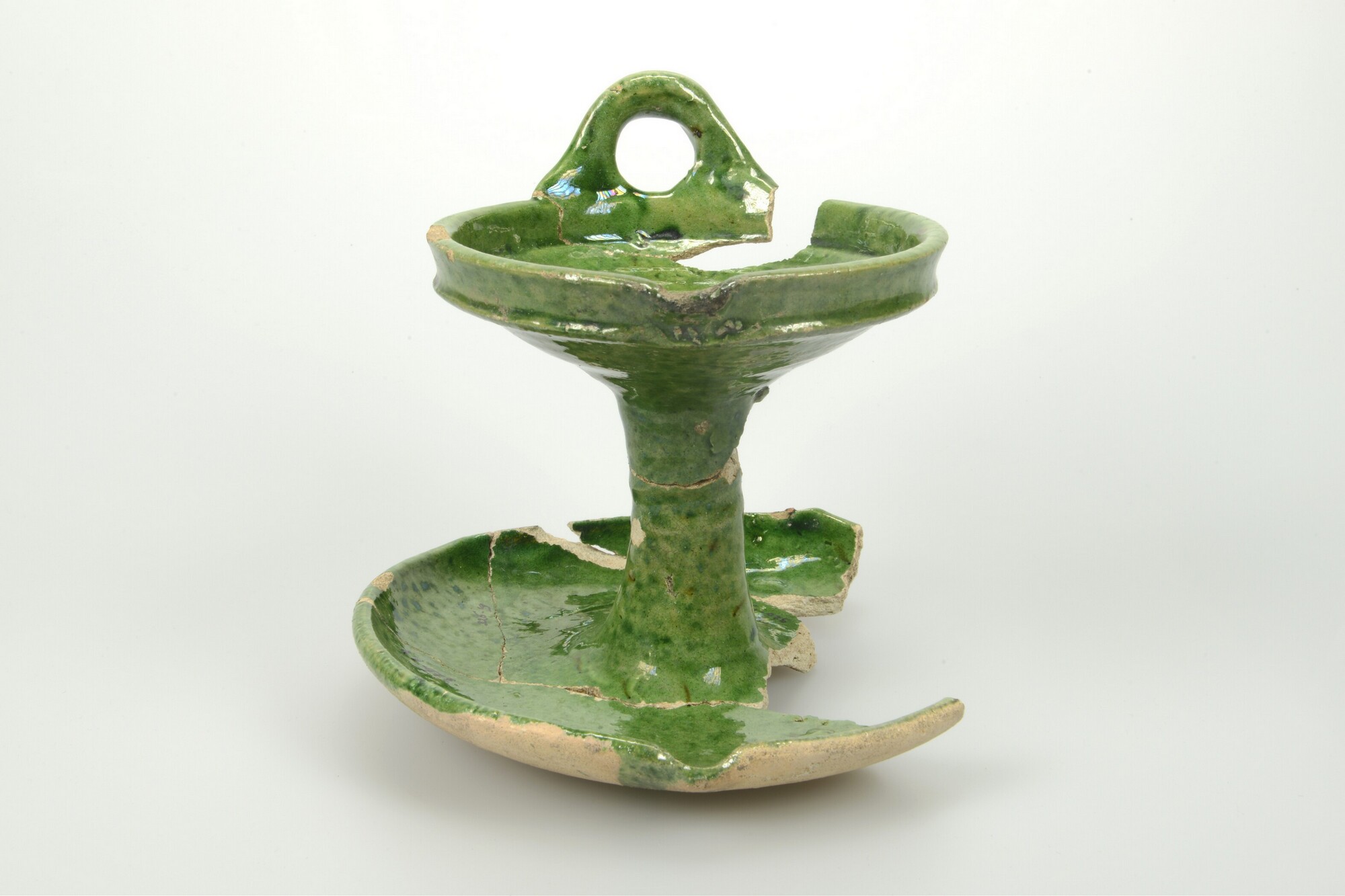 Olielamp; w-oli-2; olielamp met ophangoor, bovenste schaal met geknikte rand; witbakkend aardewerk; loodglazuur met koperoxide (uitgezonderd onderzijde schaal); schenklip; ophangoor