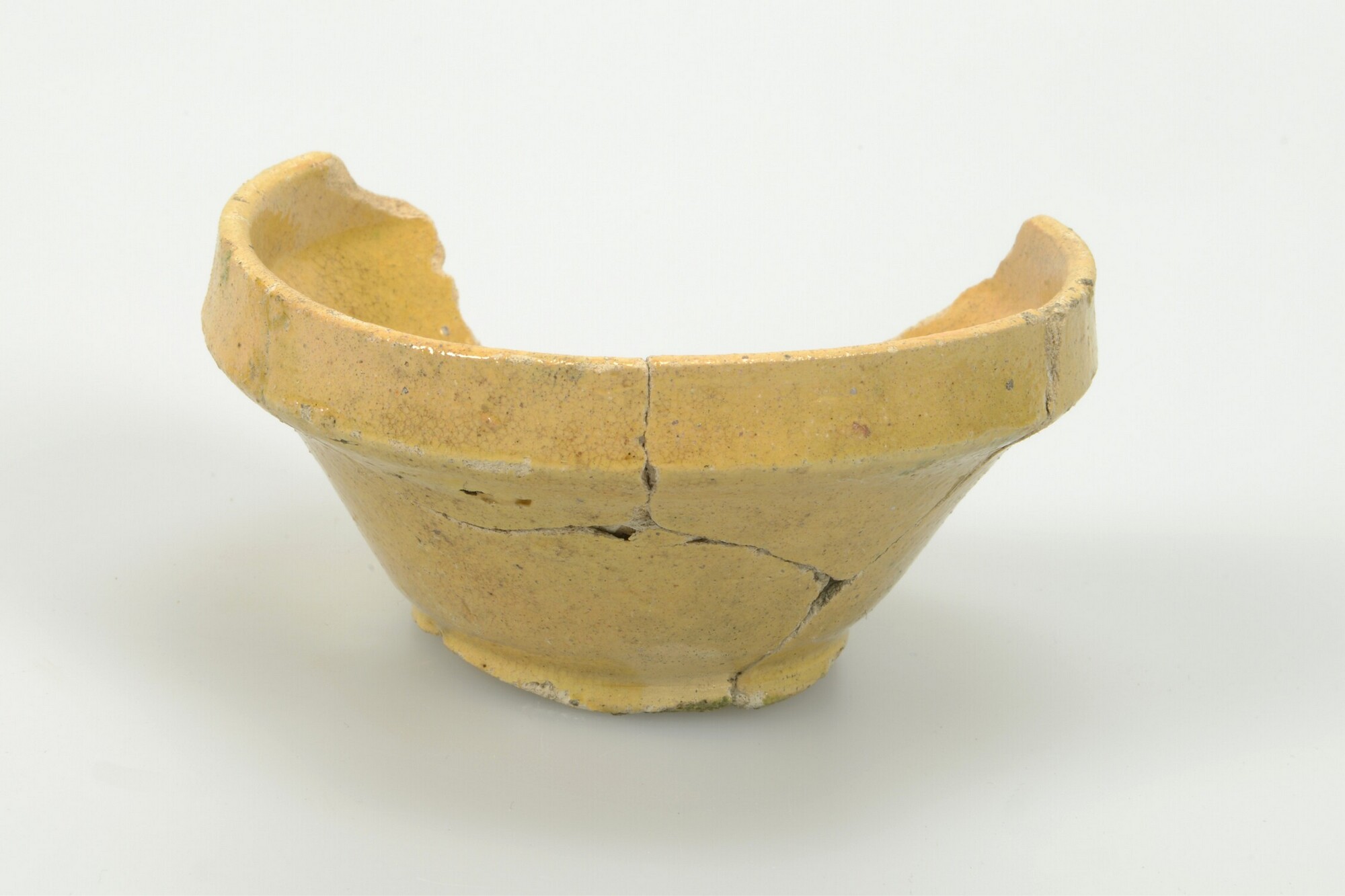 Kop; miniatuur; w-kop-30; kop met uitstaande wand en geknikte rand; witbakkend aardewerk; loodglazuur; standvlak