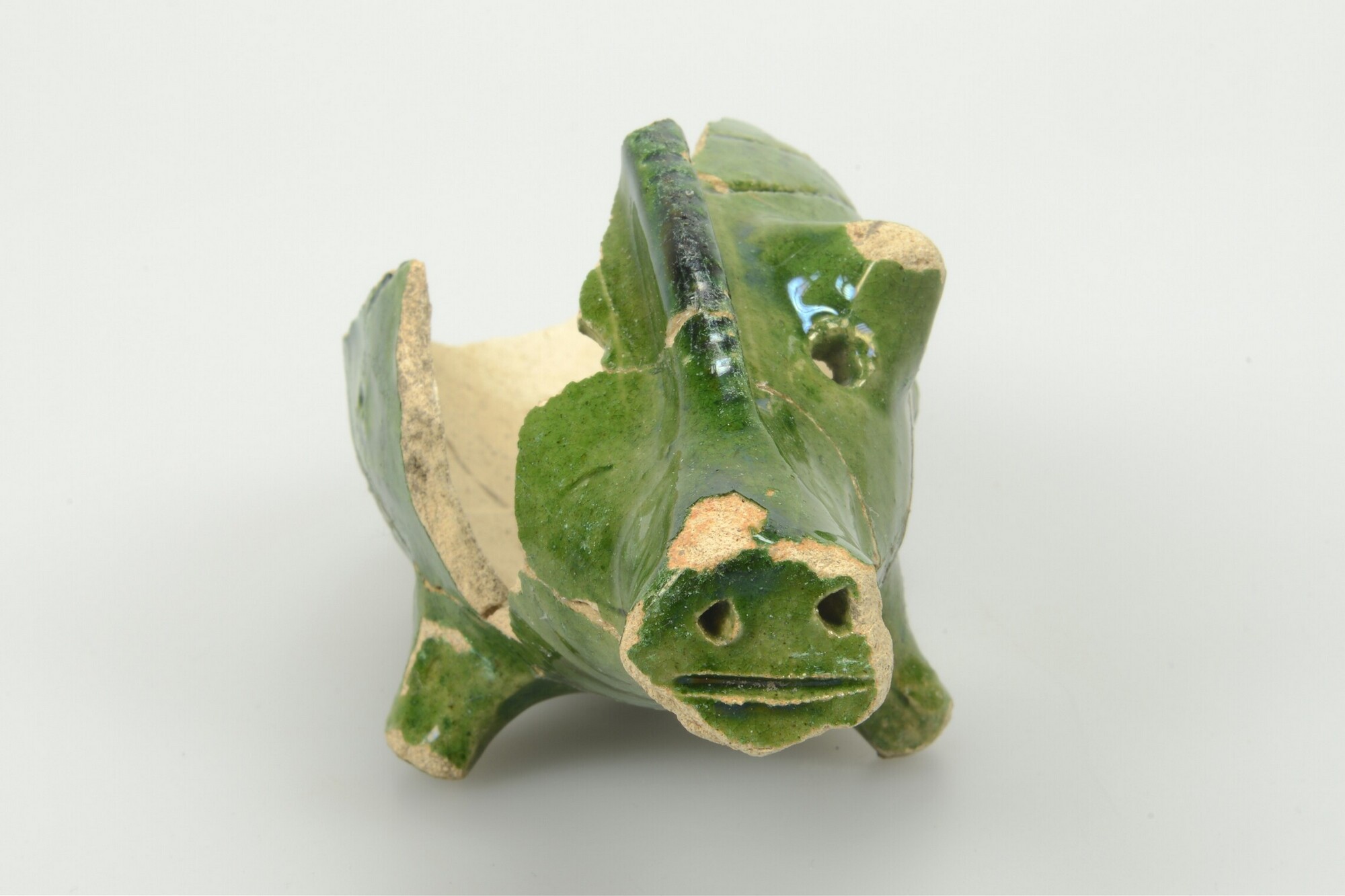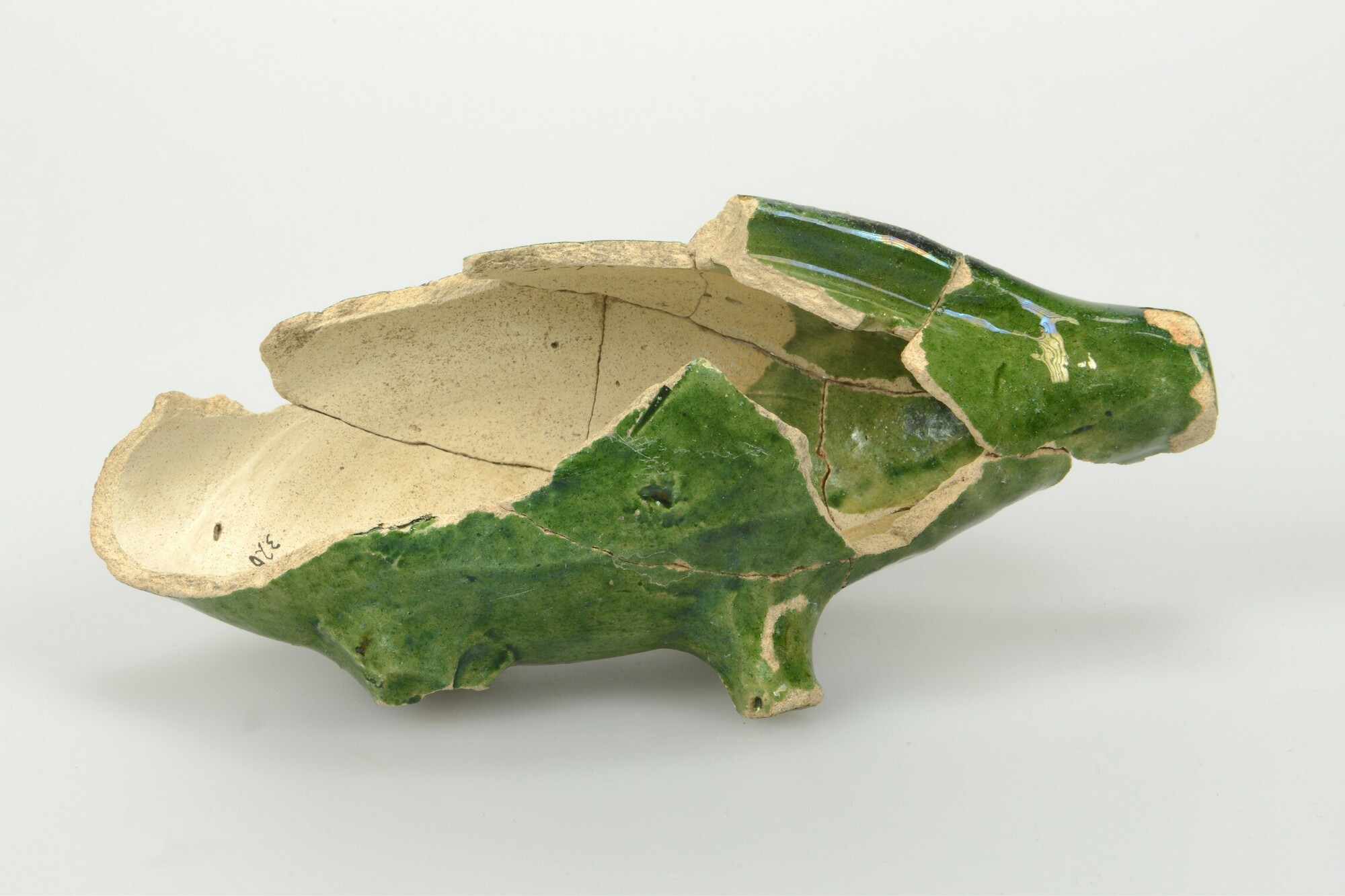 Spaarpot/spaarvarken; w-spa-1; witbakkend aardewerk; uitwendig loodglazuur met koperoxide; vier poten