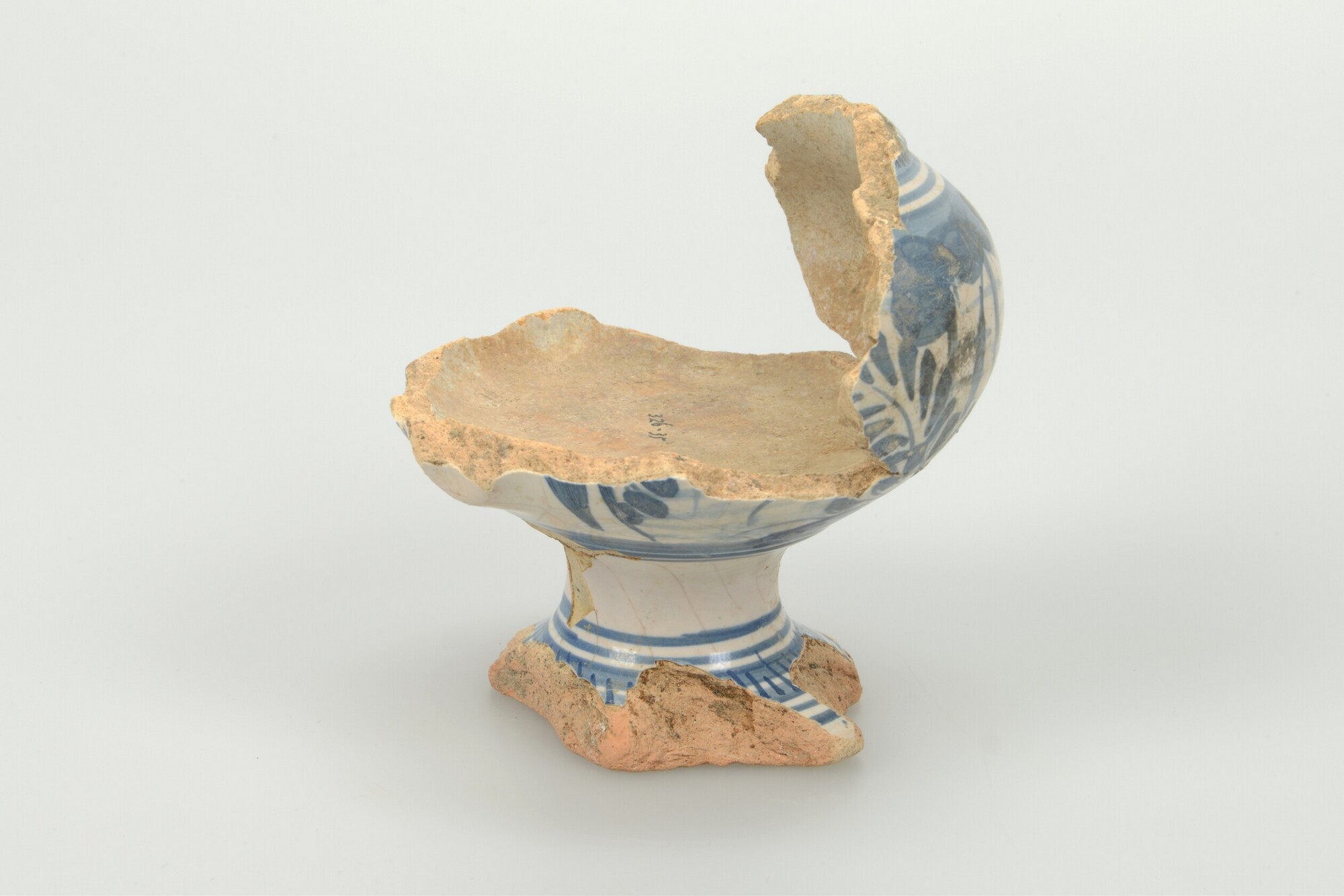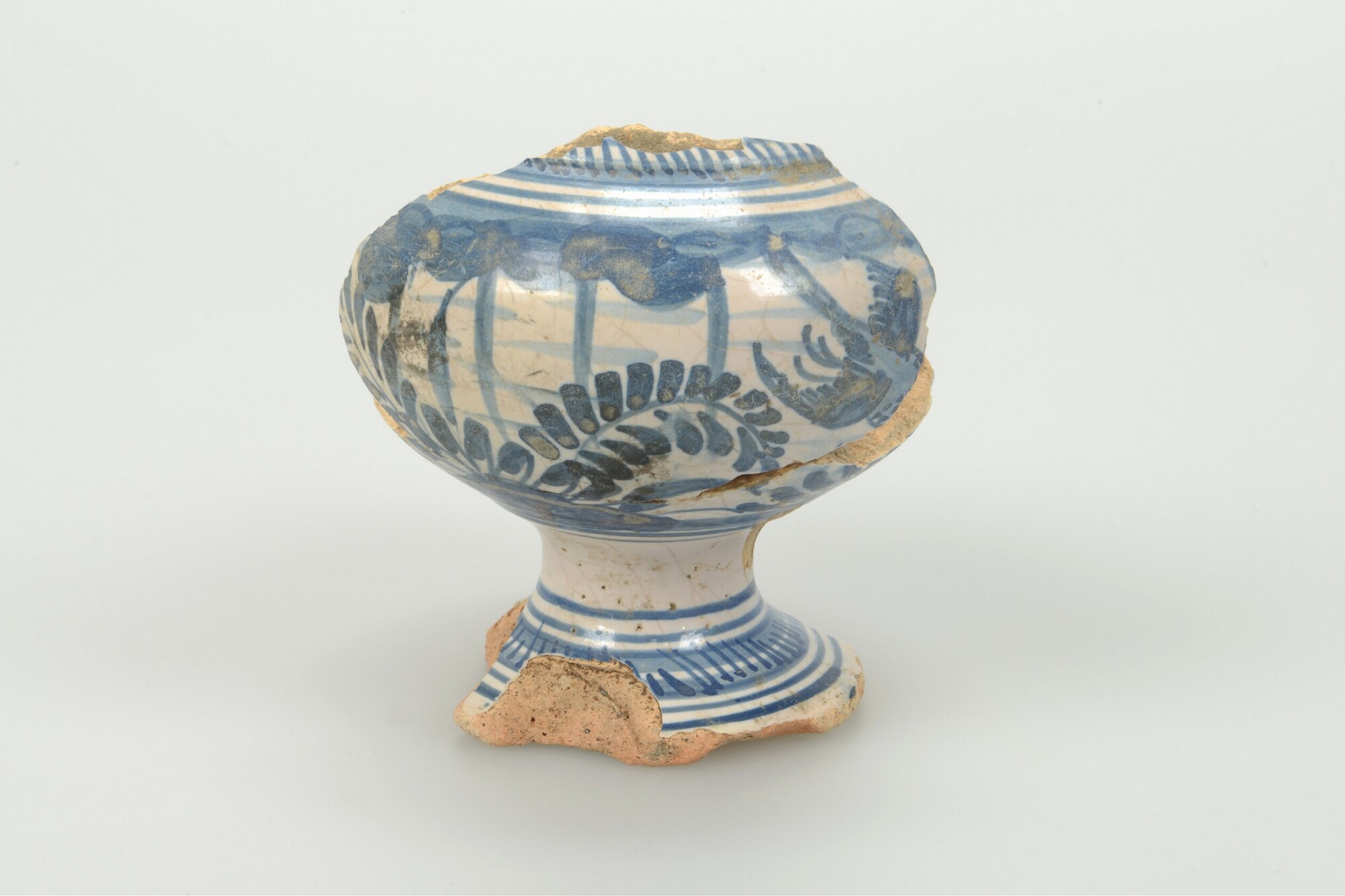 Mosterdpot; m-mos-1; bolle mosterdpot op voet; majolica; inwendig loodglazuur, uitwendig tinglazuur; blauwe beschildering: Chinese motieven; standvoet