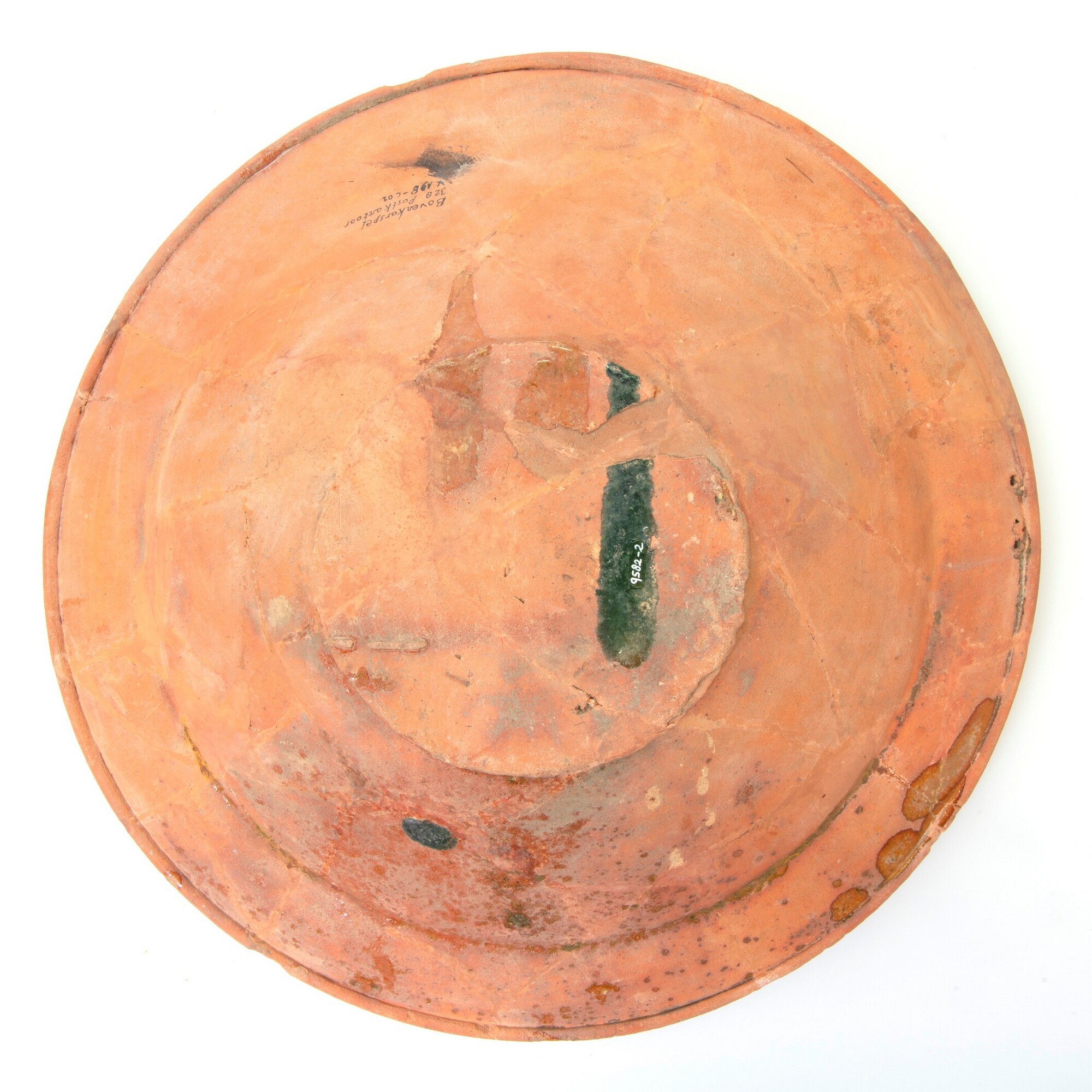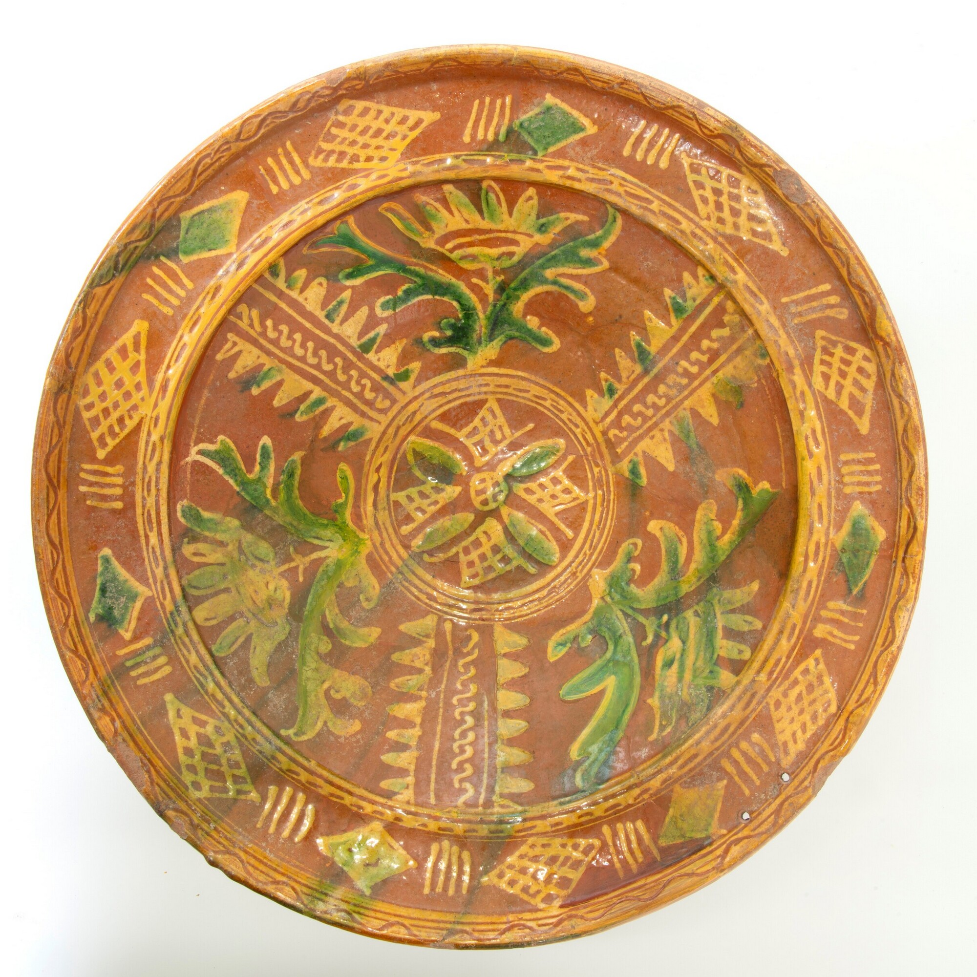 Bord; r-bor-46; bord met platte vlag en hamerkoprand, standvlak; roodbakkend aardewerk; inwendig loodglazuur; slibversiering van witte kleislib met accenten van koperoxide, spiegel: rozet, florale en geometrische motieven; vlag: geometrische motieven; twee ophanggaatjes onder rand; herkomst: Husum, Zuidwest-Denemarken (Jutland)