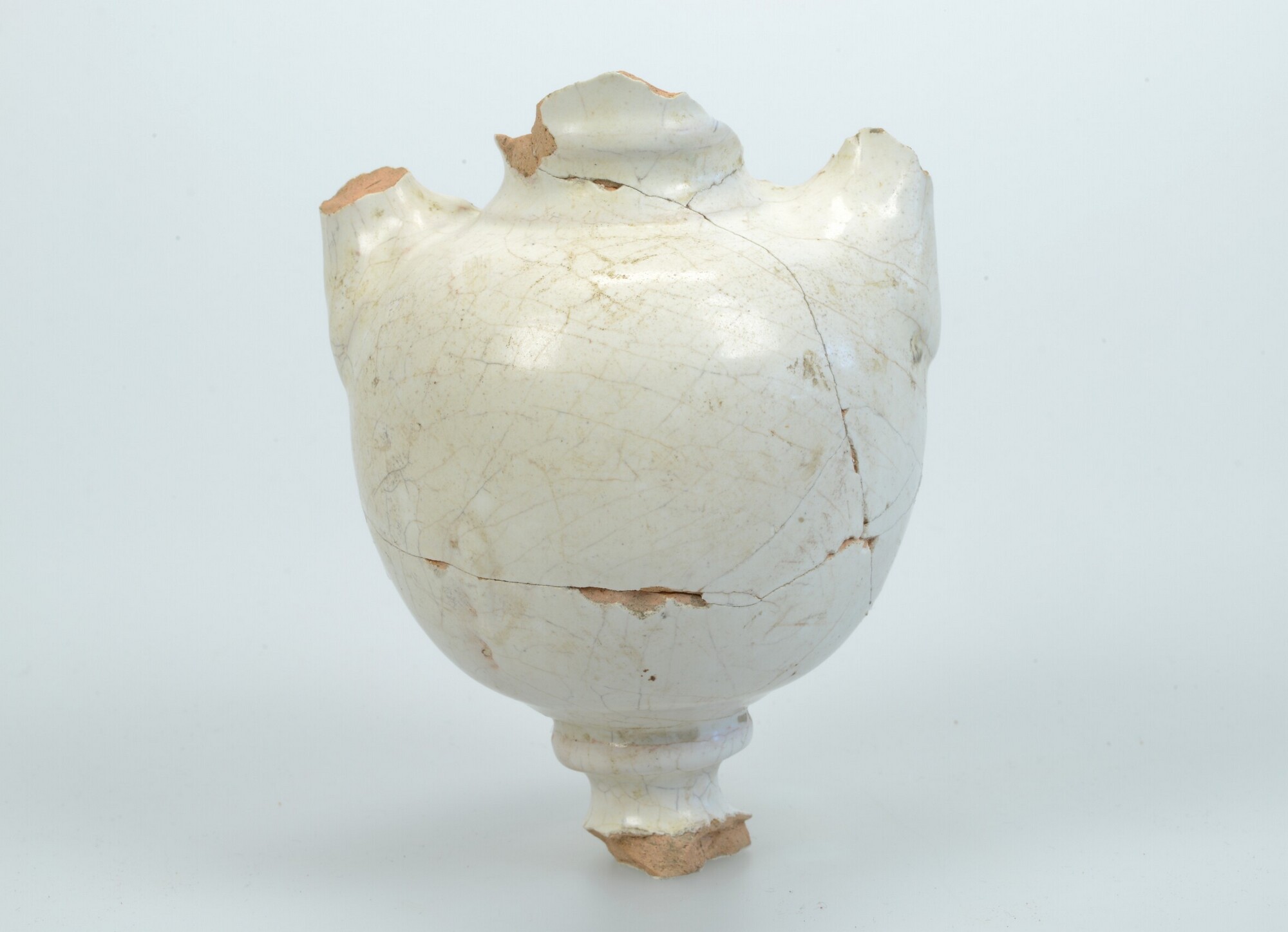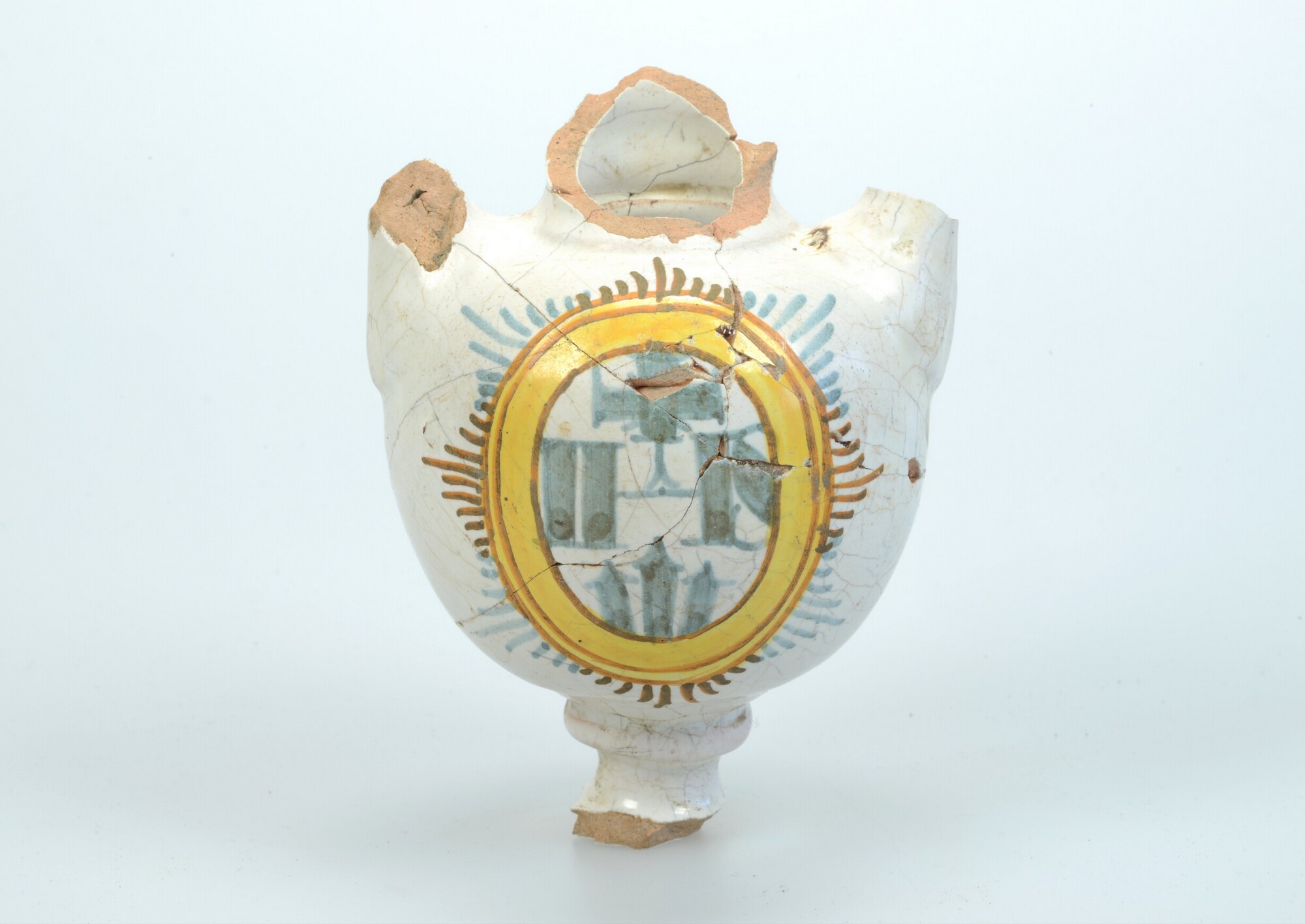 Altaarvaas; fr-vaa; bolle vaas op standvoet; Franse faience; in- en uitwendig tinglazuur; veelkleurige beschildering (blauw, geel en oker): IHS-monogram met kruis in stralenkrans; standvoet (ontbreekt); twee oren (ontbreken); productieplaats: Frankrijk, Nevers