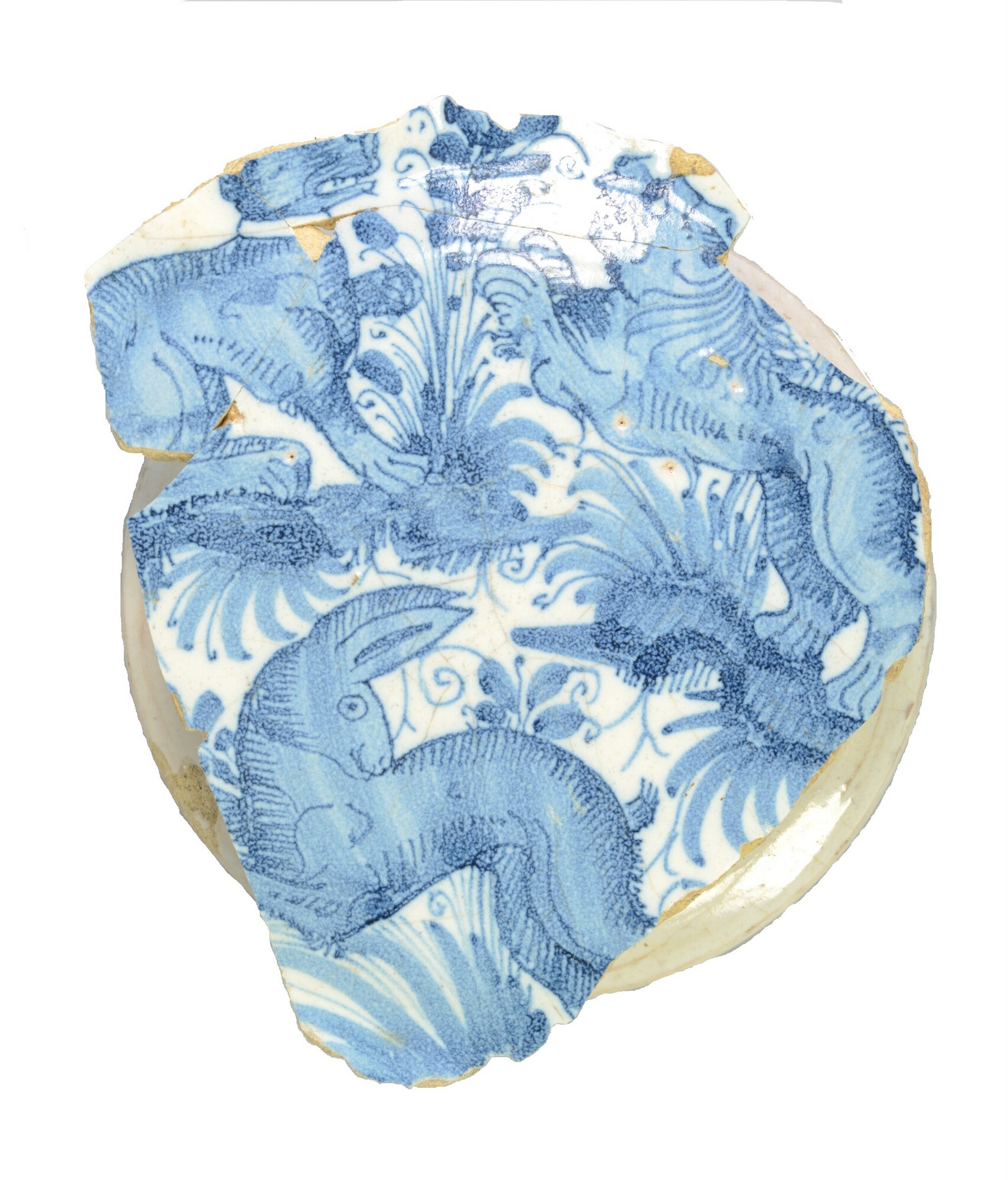 Schotel; i-plo-; blauw op wit in naturalistico calligrafico; Italiaanse faience; afgebeeld staan een hond, een leeuw en haas; standring