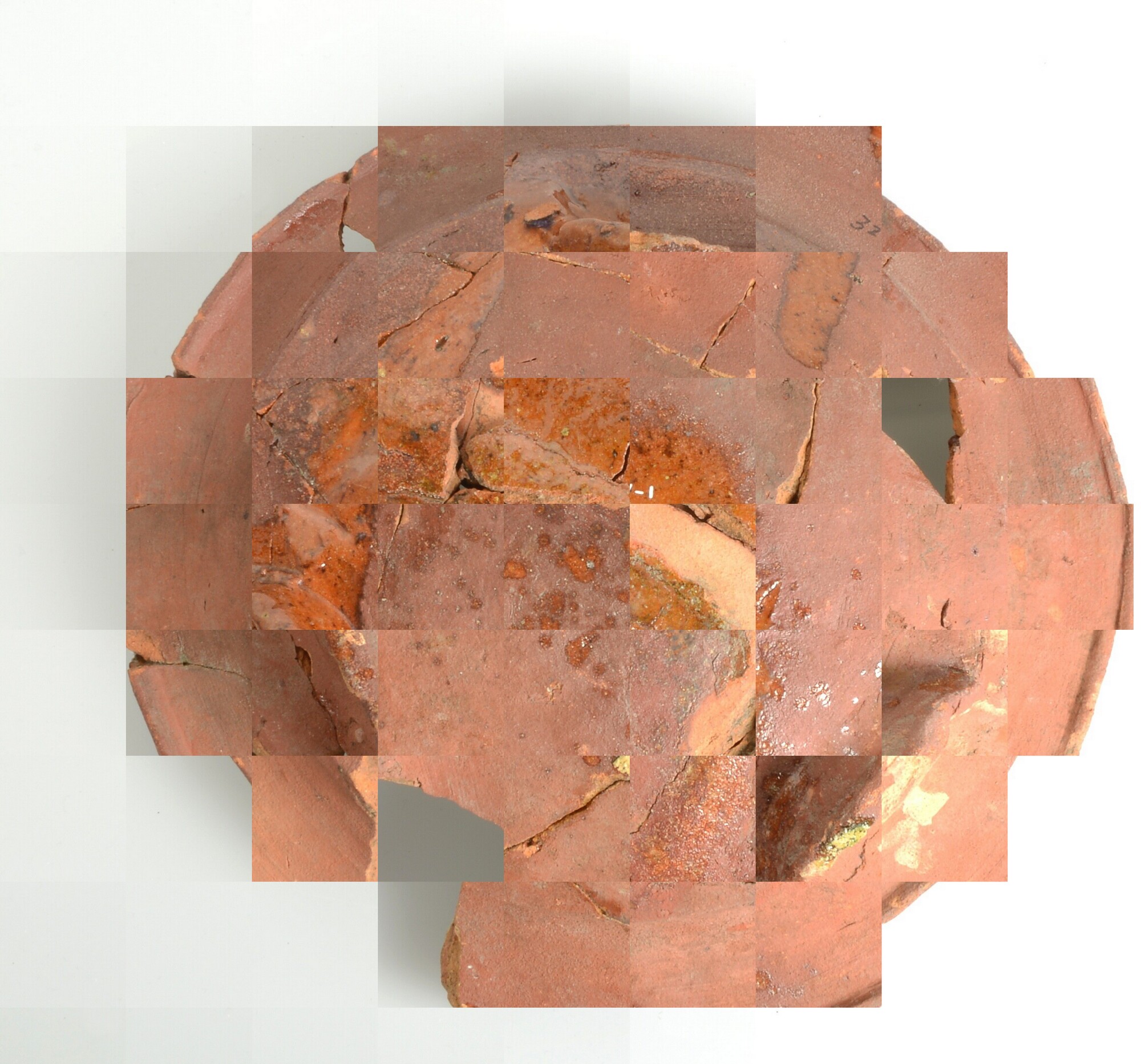 Bord; r-bor-1; roodbakkend; inwendig loodglazuur; spiegel: gekroond wapenschild met op het wapen twee naar elkaar toegewende klimmende leeuwen met tong uit de bek. Zij worden van elkaar gescheiden door middel van een verticale balk met spiraalvormig motief. Rondom het wapenschild is in vereenvoudigde vorm het keten van het Gulden Vlies afgebeeld. Herkenbaar zijn de Bourgondische ...