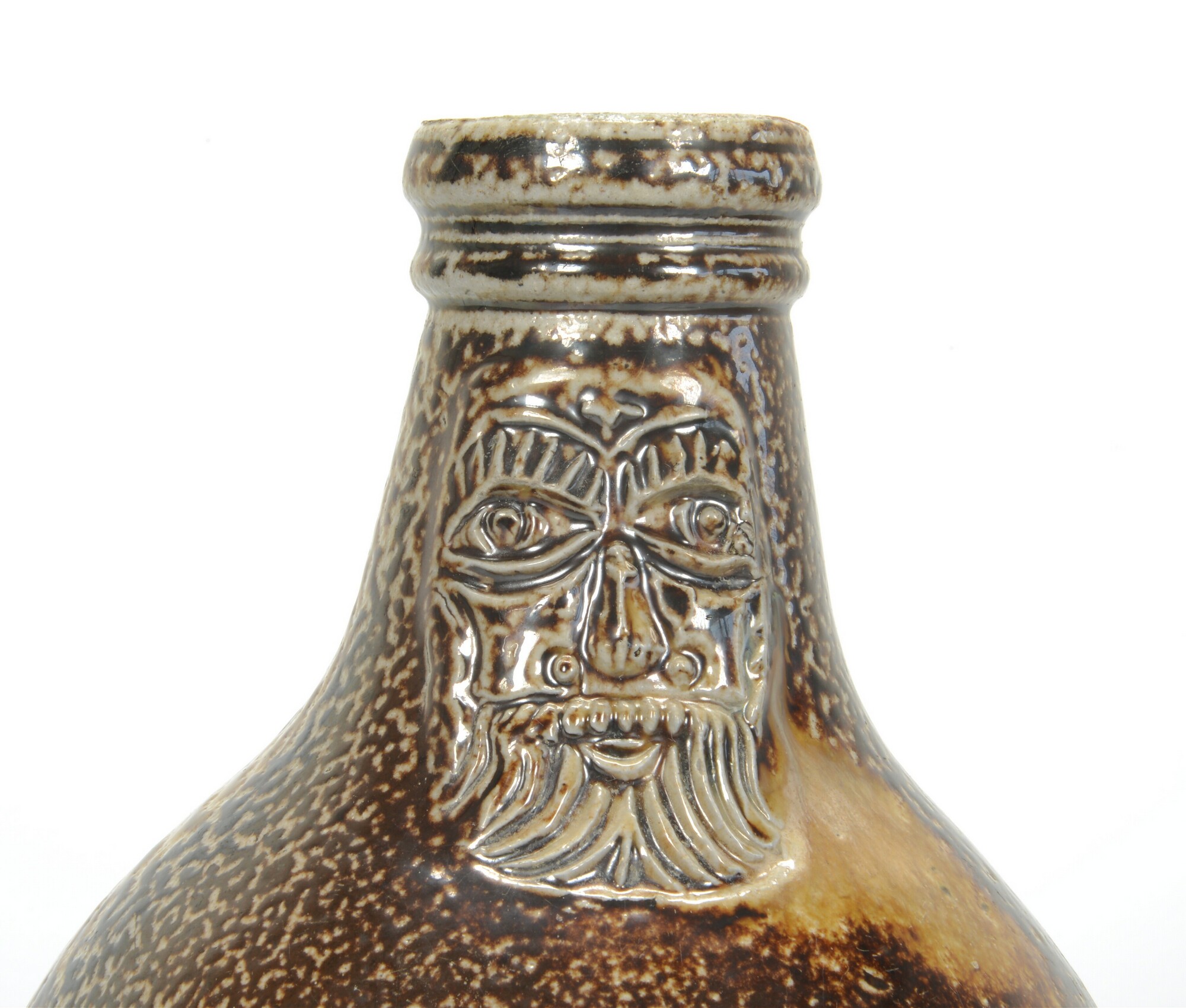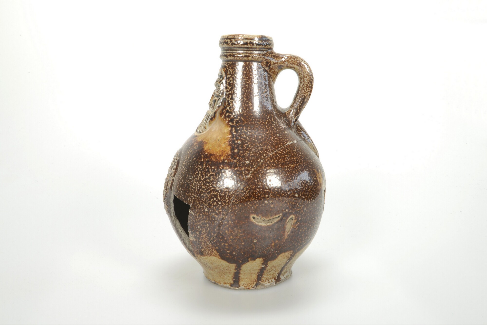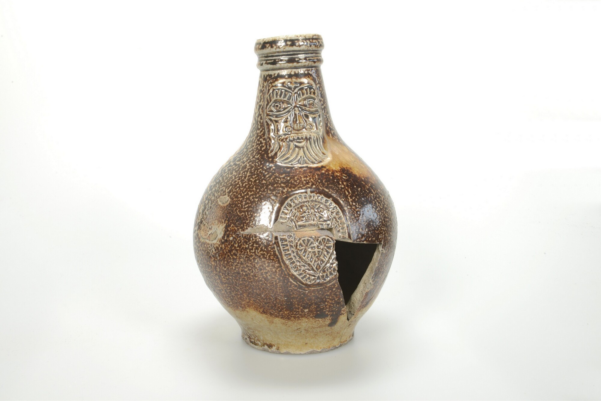 Kan; s2-kan-32; kan met bolle buik, vloeiende overgang naar hals en geprofileerde rand; steengoed met oppervlaktebehandeling; uitwendig zoutglazuur met ijzerengobe; baardman, medaillon met hart; standvlak; lintoor; herkomst: Keulen