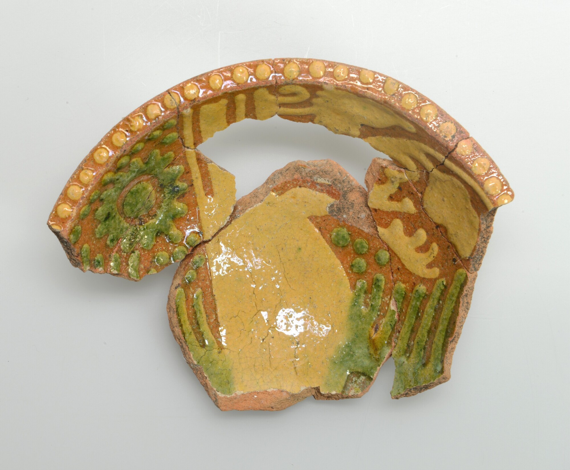 Kom; r-kom-13; roodbakkend; Noord-Hollands sliversierd; loodglazuur inwendig; afbeelding van een vogel met groene vleugels en de rand is voorzien van een gele slibversiering in de vorm van stippen; standring; herkomst: Noord-Holland