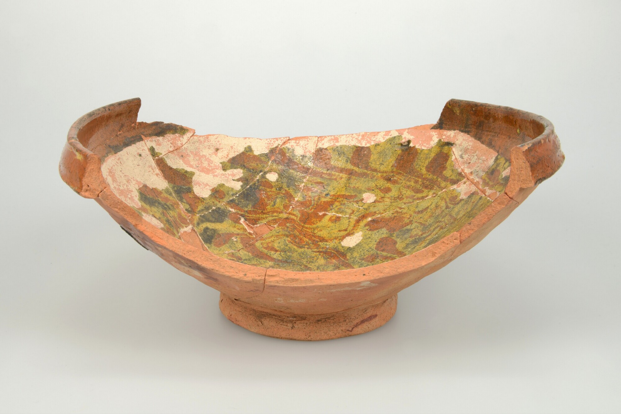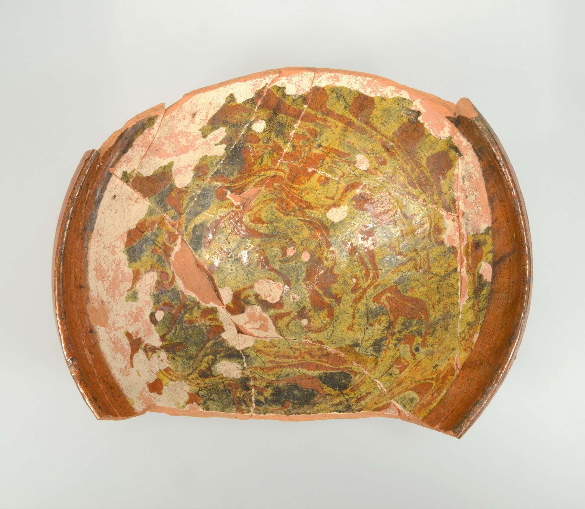 Kom; r-kom-; roodbakkend aardewerk; inwendig loodglazuur en gemarmerd; standvoet; Friesland