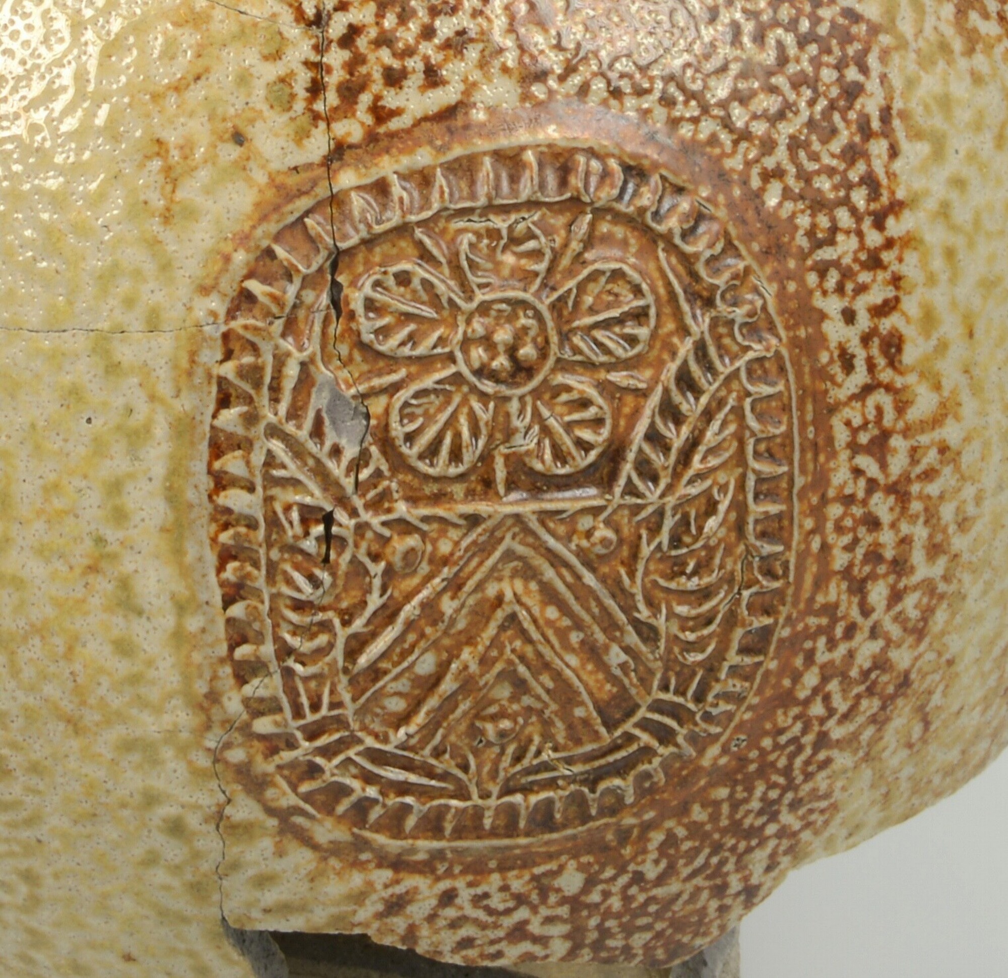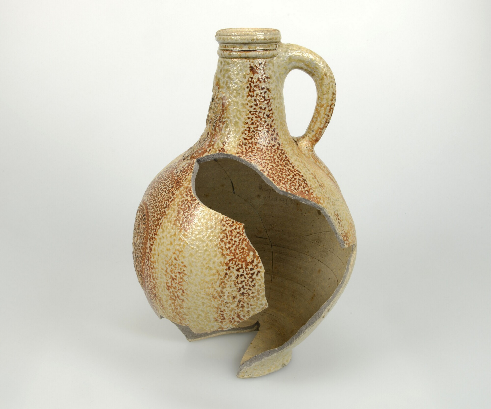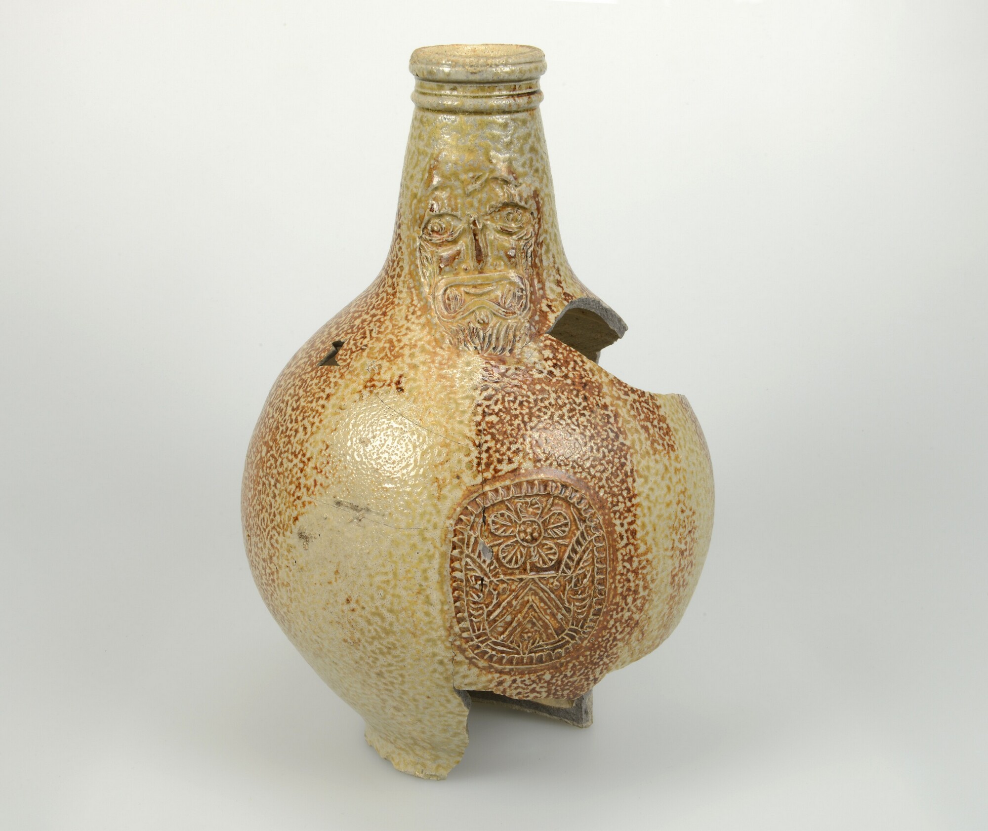Baardmankruik; s2-kan; steengoed met glazuur; ijzerengobe en zoutglazuur; pantermotief, baardman op hals en rozet op buik; standvlak; herkomst: Frechen
