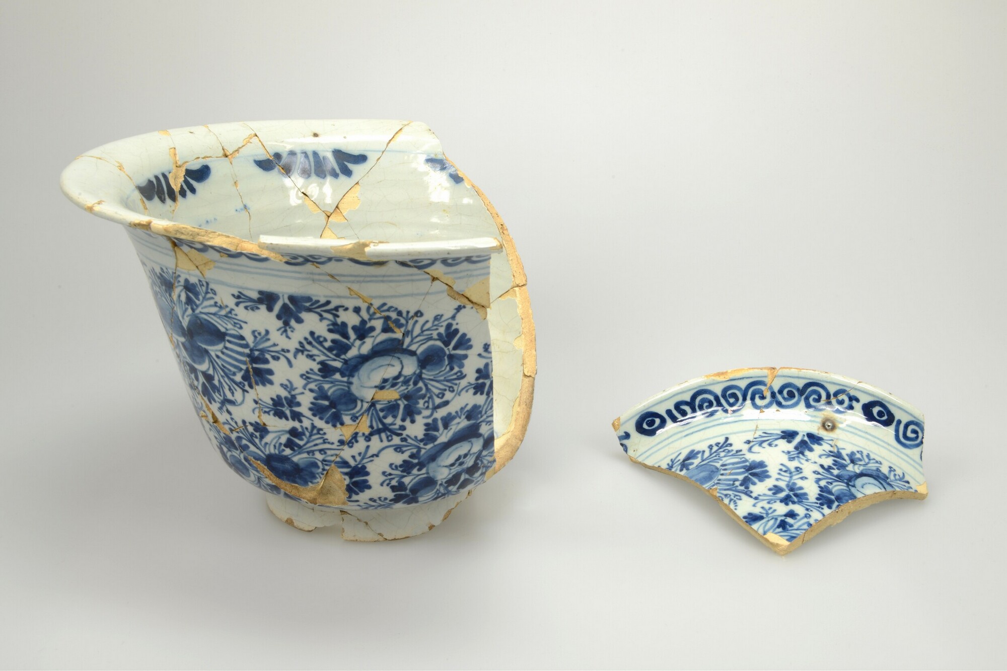 Kom/tuinpot; f-kom-; rechte wand met uitlopende rand en standring; faience; tinglazuur; blauwe beschildering op witte achtergrond; buitenkant versierd met bloemen, binnenkant met ruitpatroon op bodem en verfstreken onder de rand; herkomst: Delft