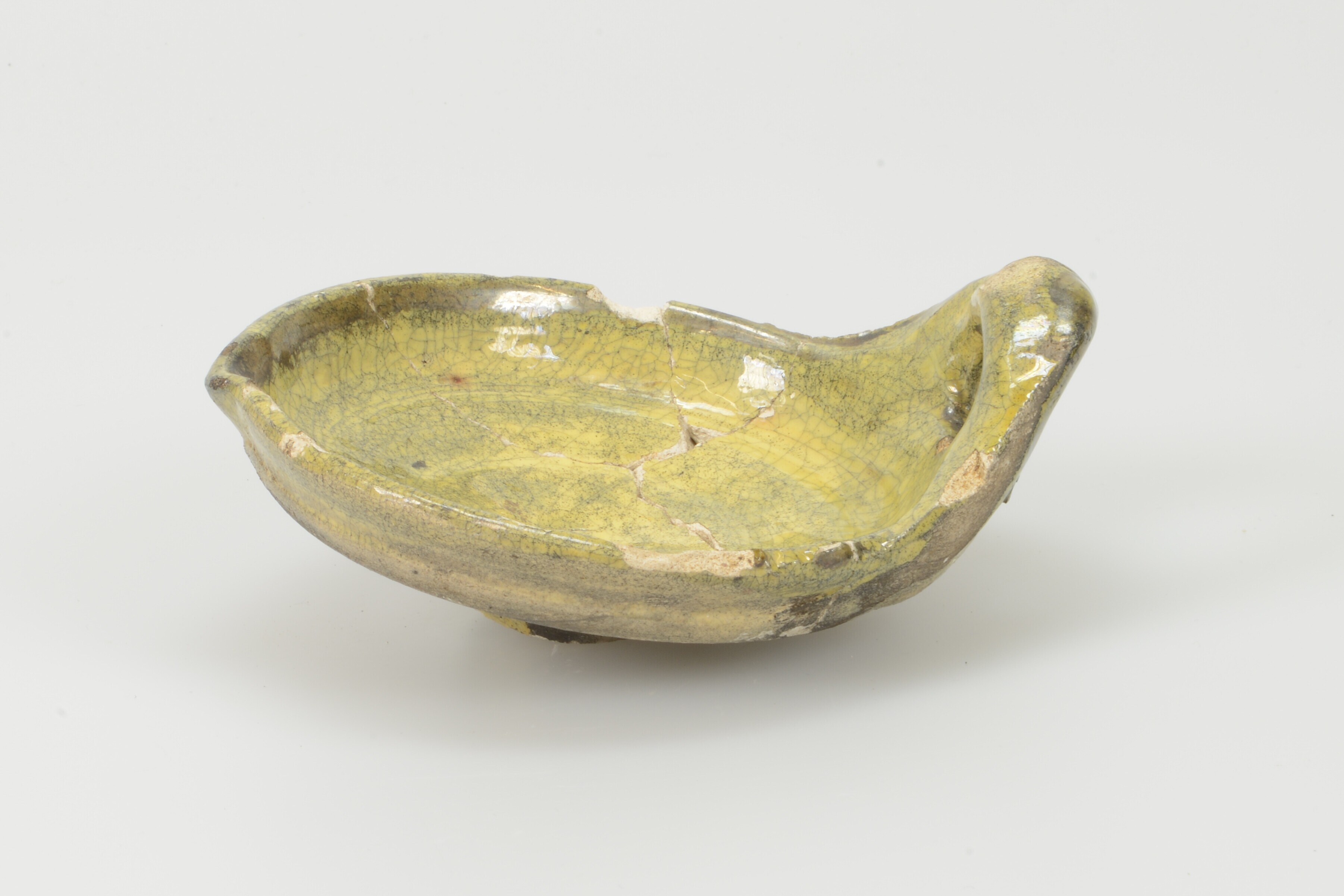 Olielamp; w-oli-?; witbakkend aardewerk met loodglazuur; alleen bovenste schaal, schenklip, ophangoor