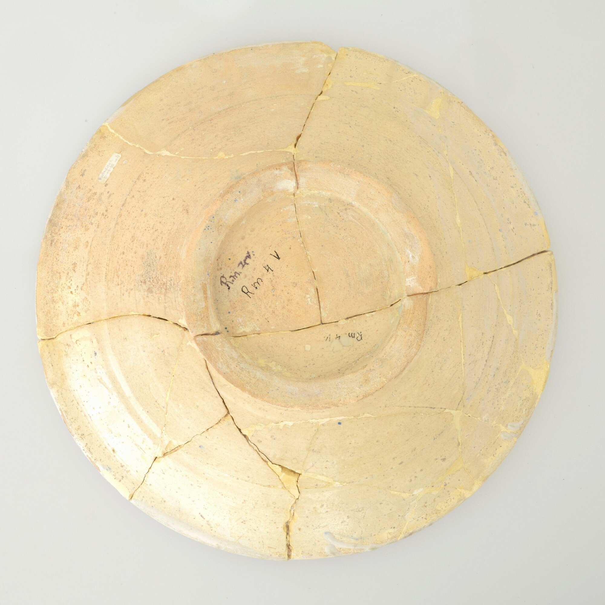 Bord; m-bor-?; inwendig tinglazuur met blauwe beschildering, uitwendig loodglazuur; scene: landschap met zittende, drinkende man; standring; productieplaats: Harlingen?