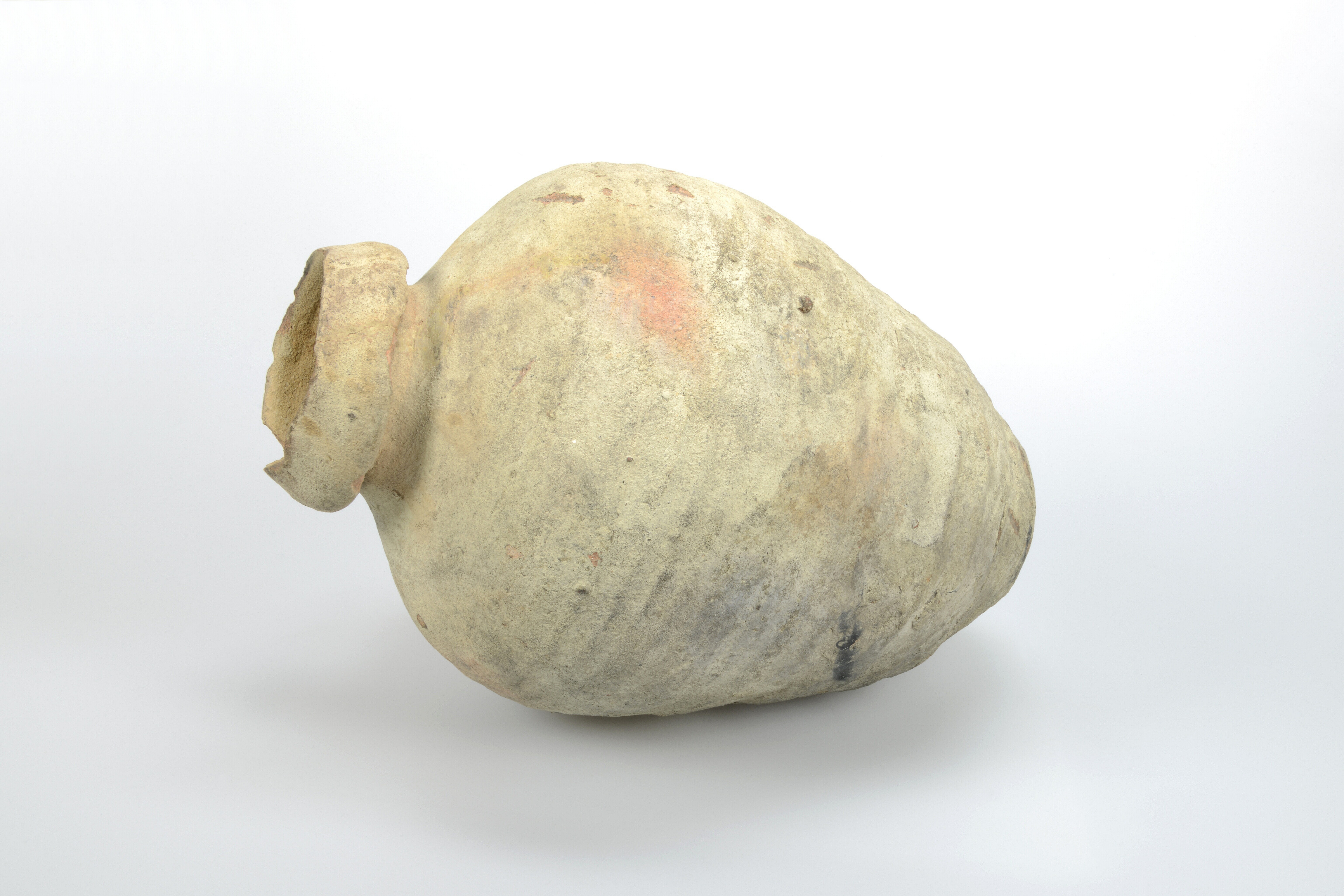 Kruik; ib-amf-2; amfoor met uitgerekte peervorm en zware kraagrand, bolle bodem; mediterraan witbakkend aardewerk; herkomst: Iberisch schiereiland